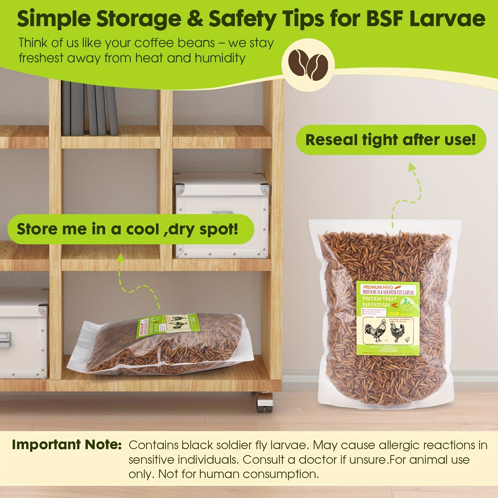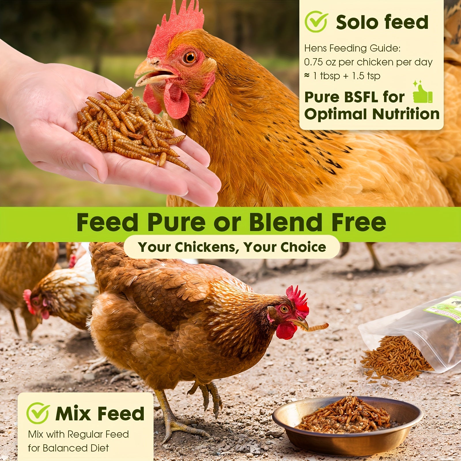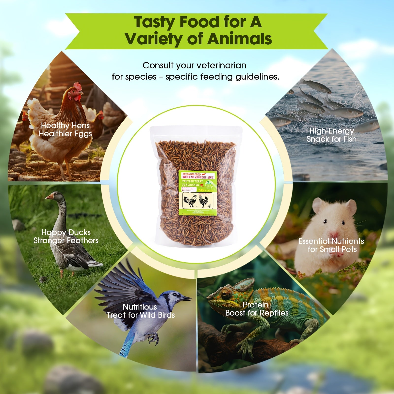 Rich in protein and essential nutrients, they boost the immune system, improve overall health, and promote fast feather regrowth during molting. Conveniently packed in a resealable bag for lasting freshness, this feed is suitable for a variety of animals and has a two-year shelf life.