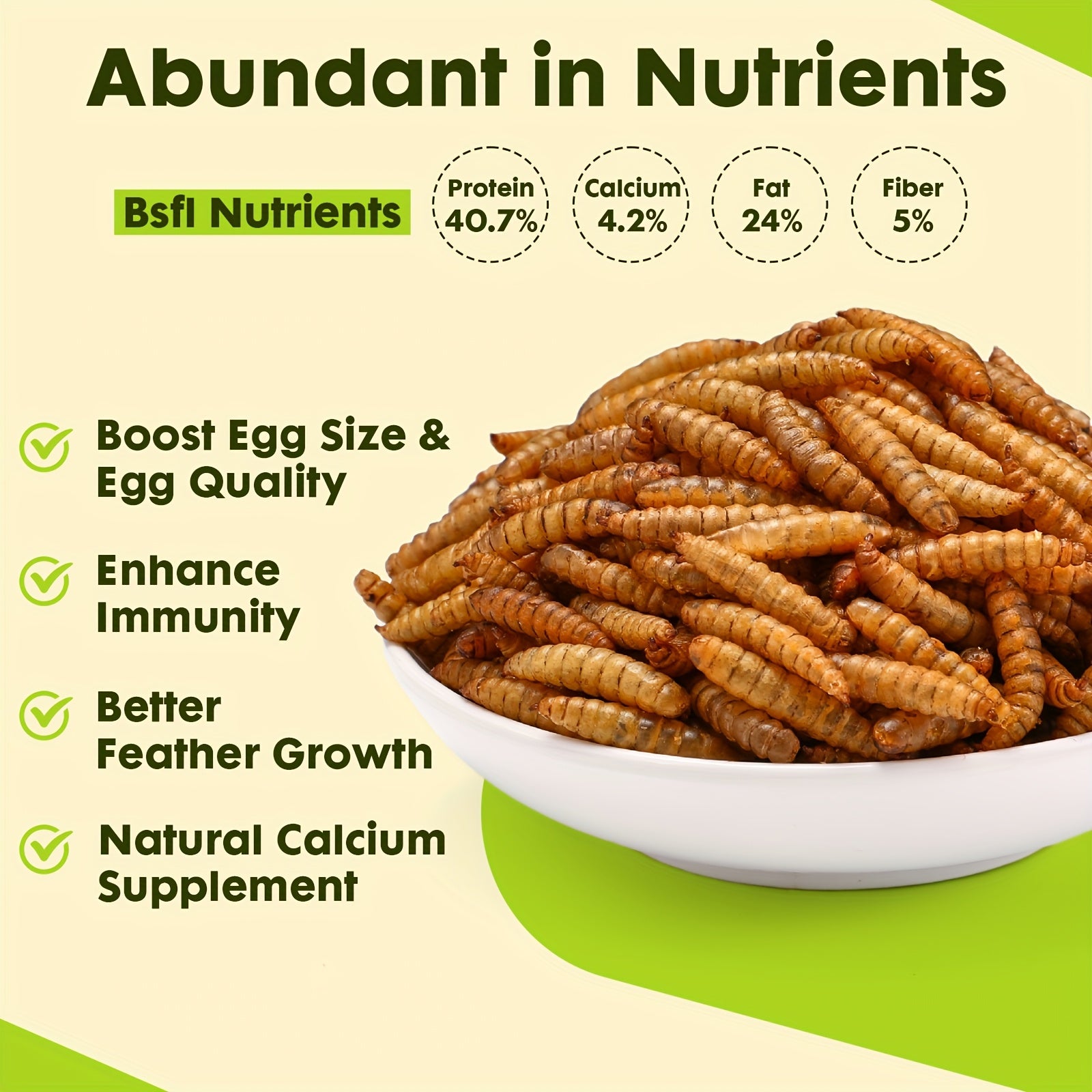 High-protein dried black soldier fly larvae provide a nutrient-rich supplement ideal for chickens, ducks, and other poultry, as well as reptiles, birds, fish, and small animals. Packed with calcium—up to 80–85 times more than mealworms—these larvae help hens produce eggs with stronger shells and support healthy growth in chicks when finely crushed or chopped.