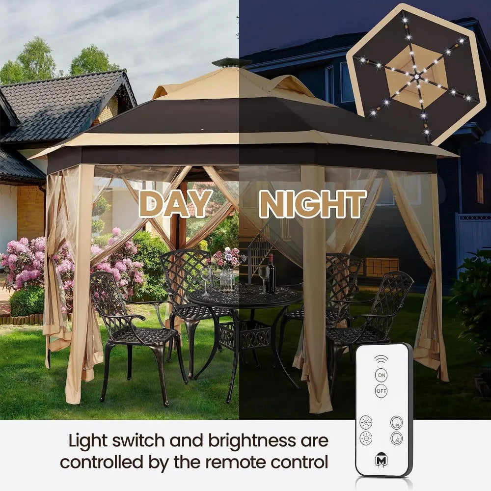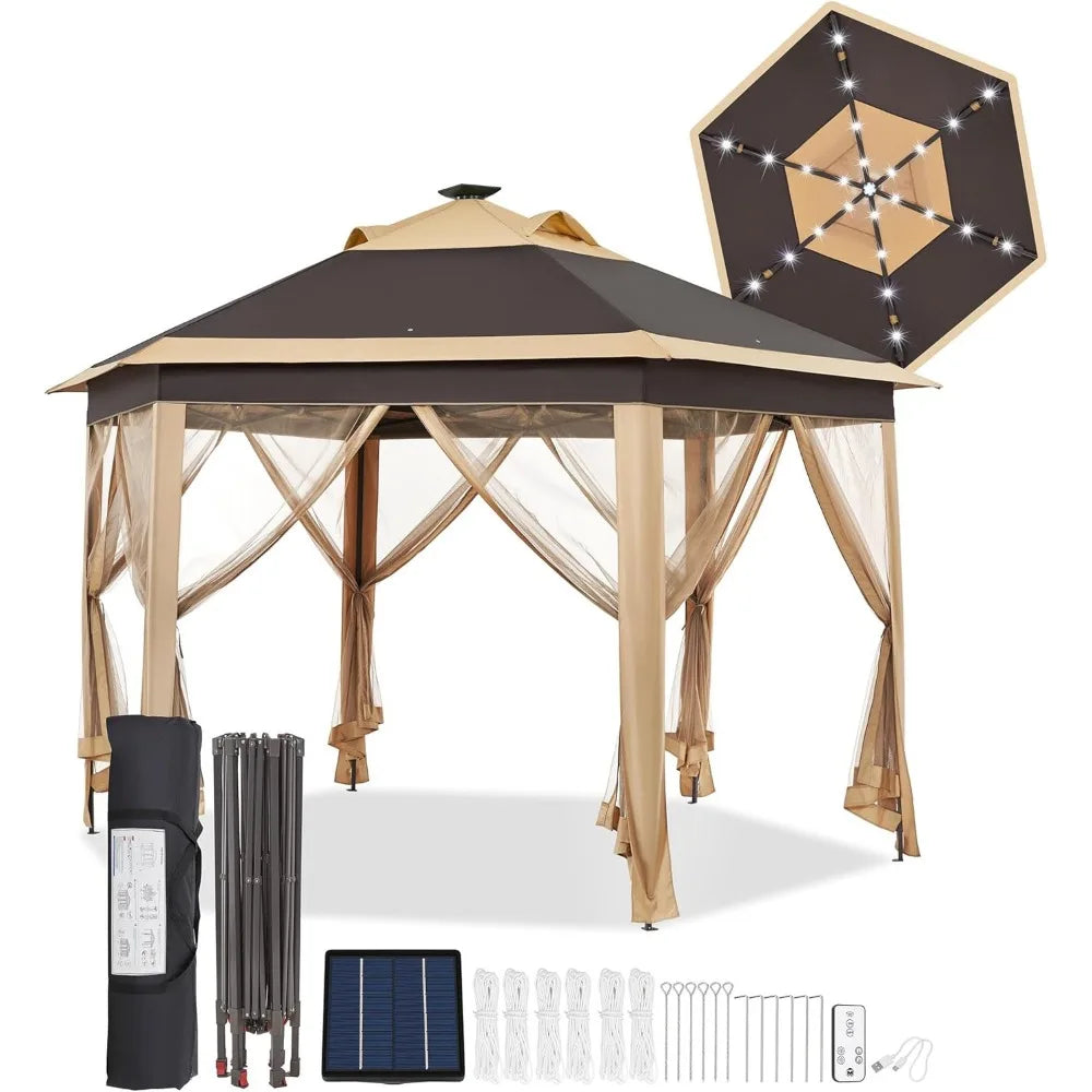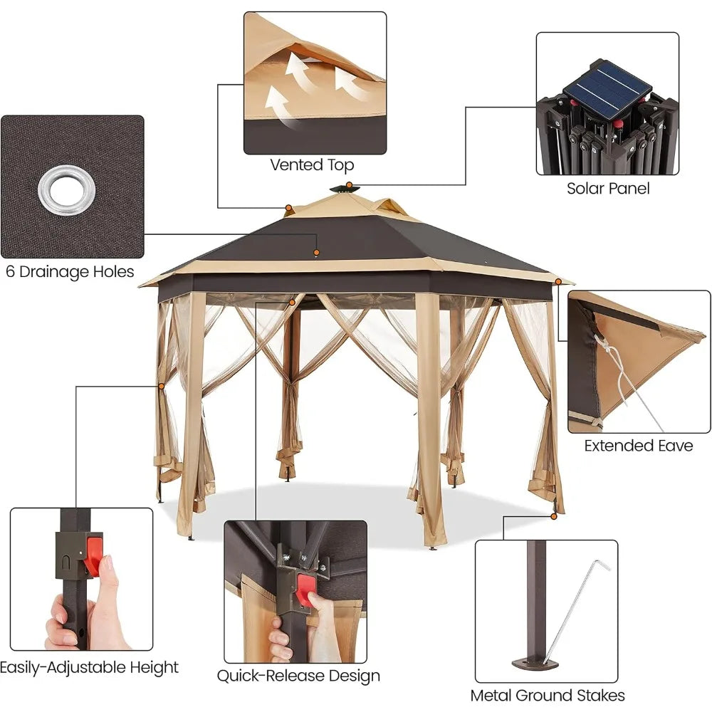 13x13 Pop-up Patio Gazebo Tent W/Mesh Netting Sides & 25 Solar LED Lights, Hexagonal Double Vented 3 Height Adjustable Gazebo w