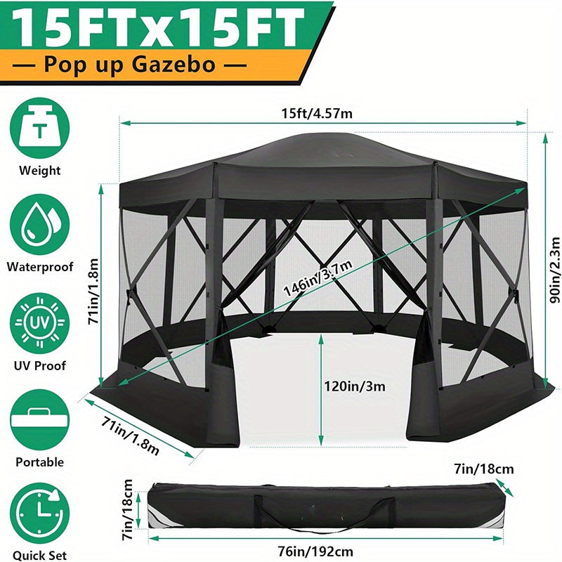 Enjoy instant shade and protection with this 15x15ft pop-up gazebo tent. Designed for convenience, this canopy shelter features a durable alloy frame and a waterproof cover, making it perfect for outdoor gatherings, camping, and backyard relaxation. The included mosquito netting keeps insects at bay, while the hook and loop closure ensures a secure fit.