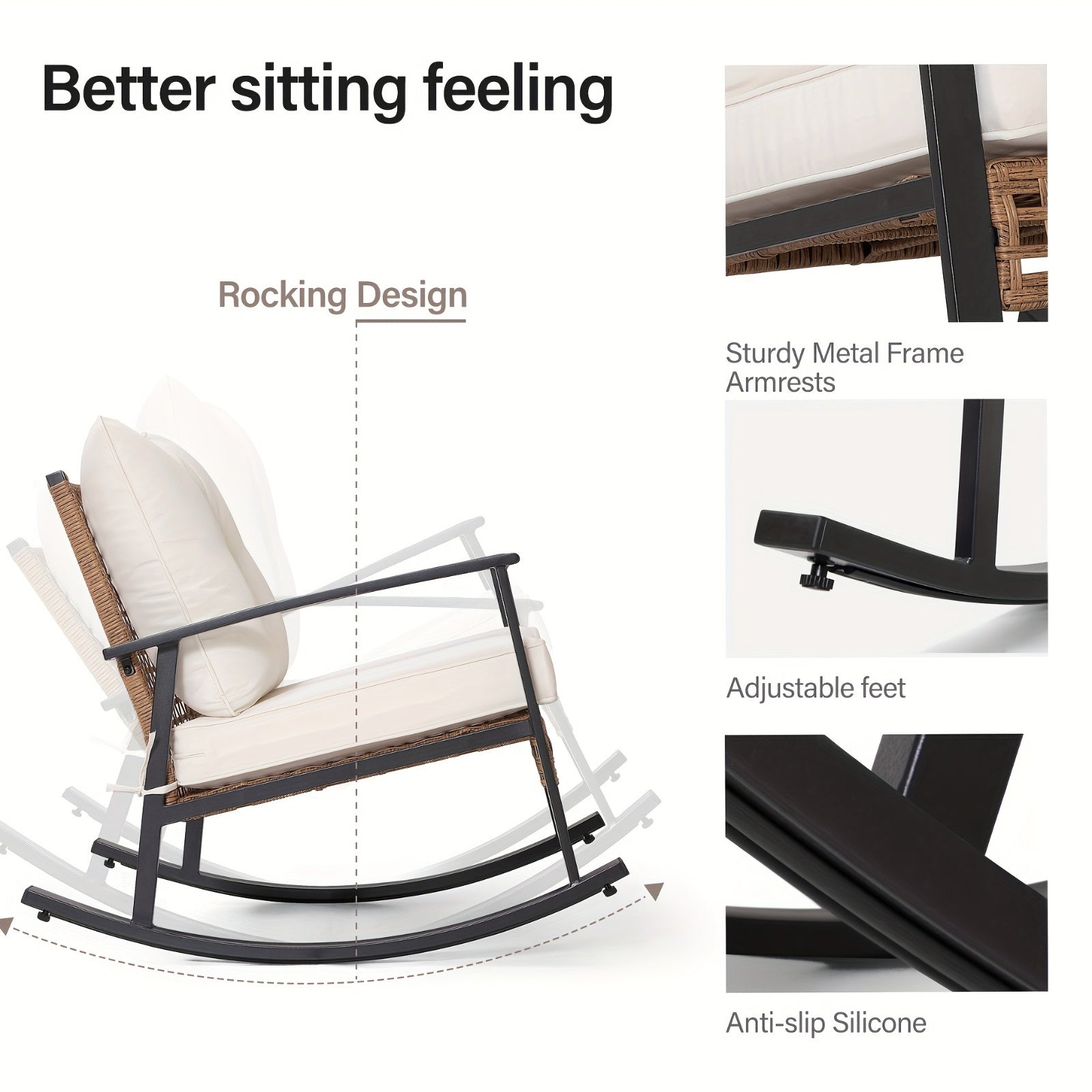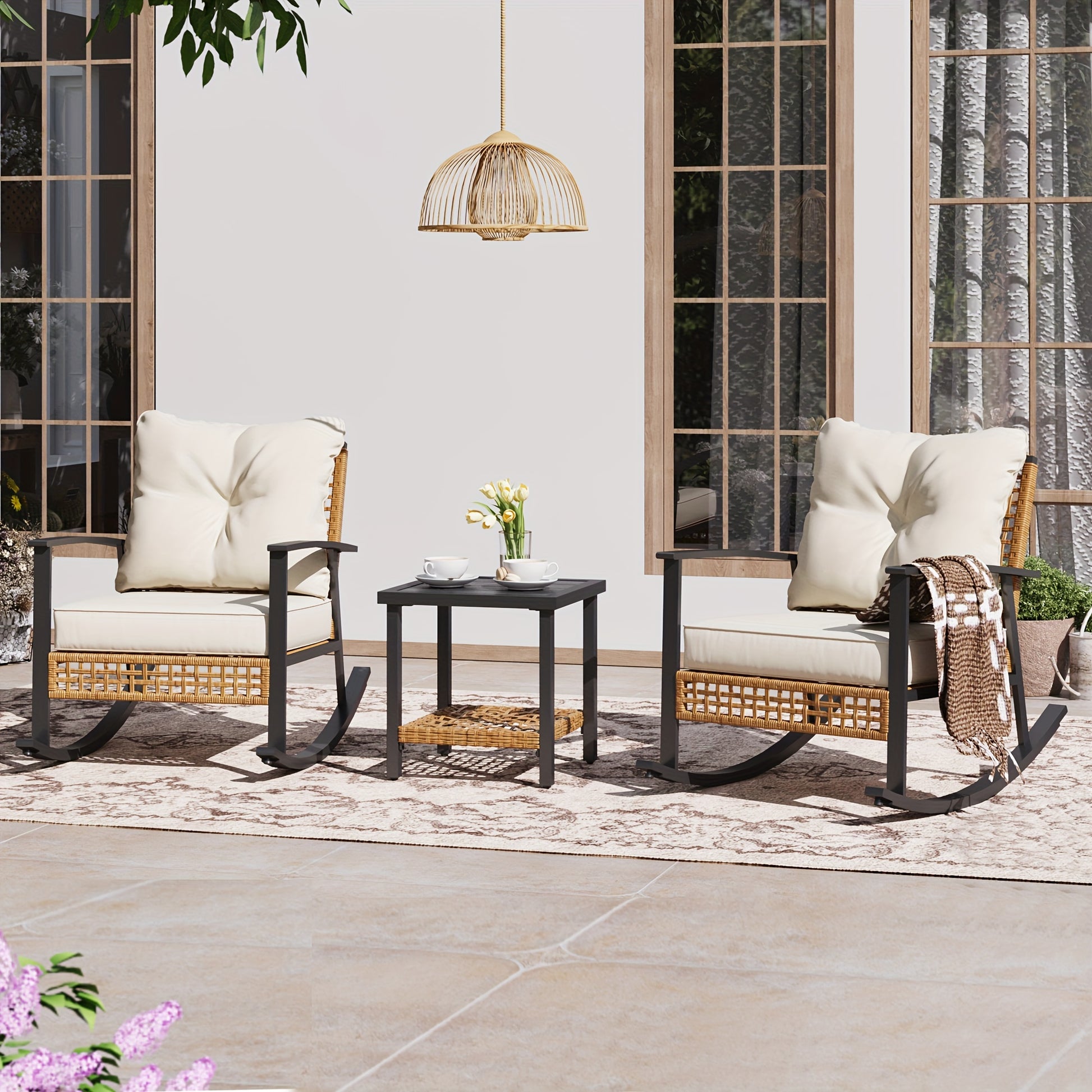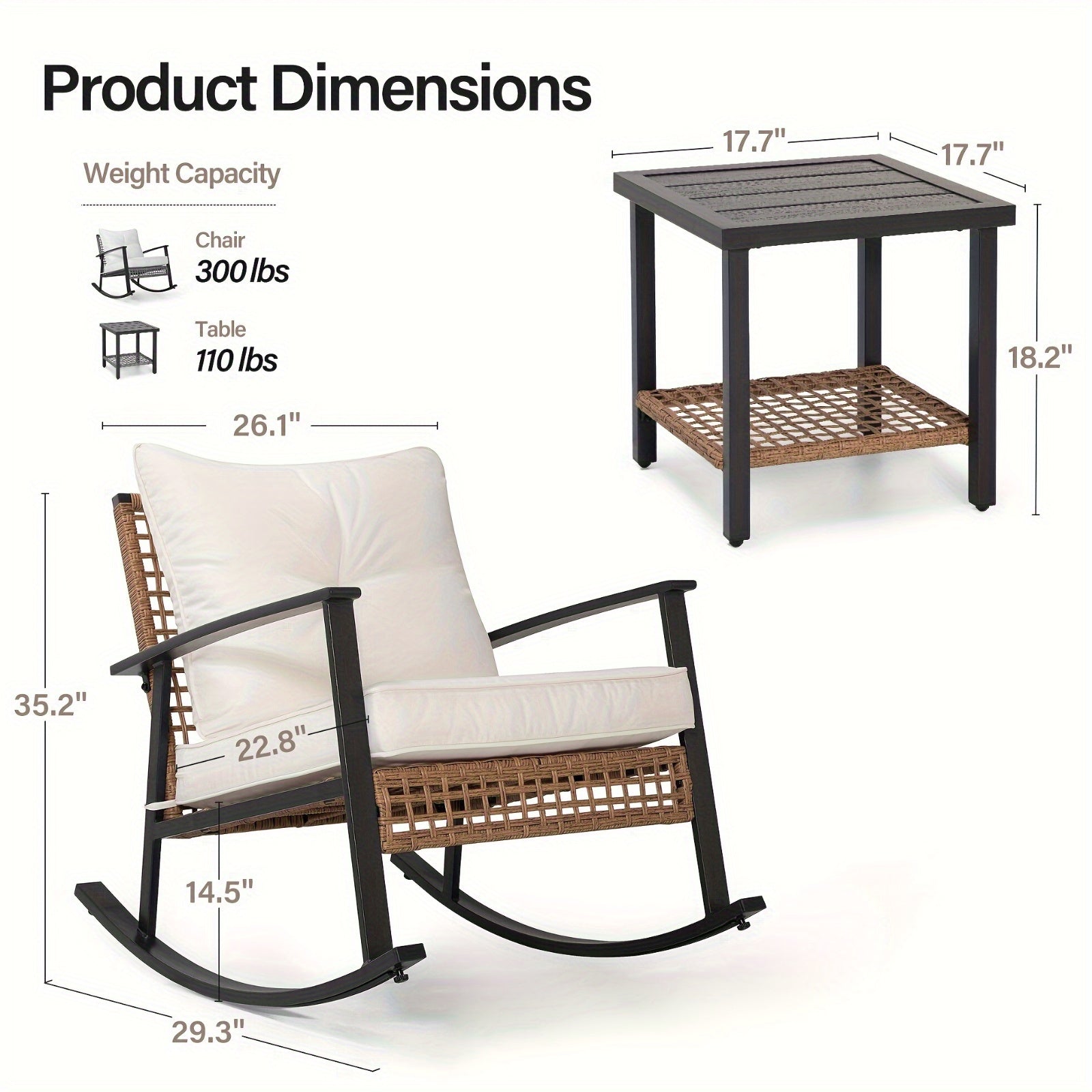 【Durable Metal & Rattan Frame】 Compared with other ordinary rattan, the frame of this patio bistro set is made of study metal and rattan material. The widened rattan has a hollow design, which is simple and fashionable. Additionally, the powder-coated metal rocking chairs and tables are built to be rust-resistant. This patio wicker rocking chair set can withstand rain, sun exposure, and wind effortlessly.