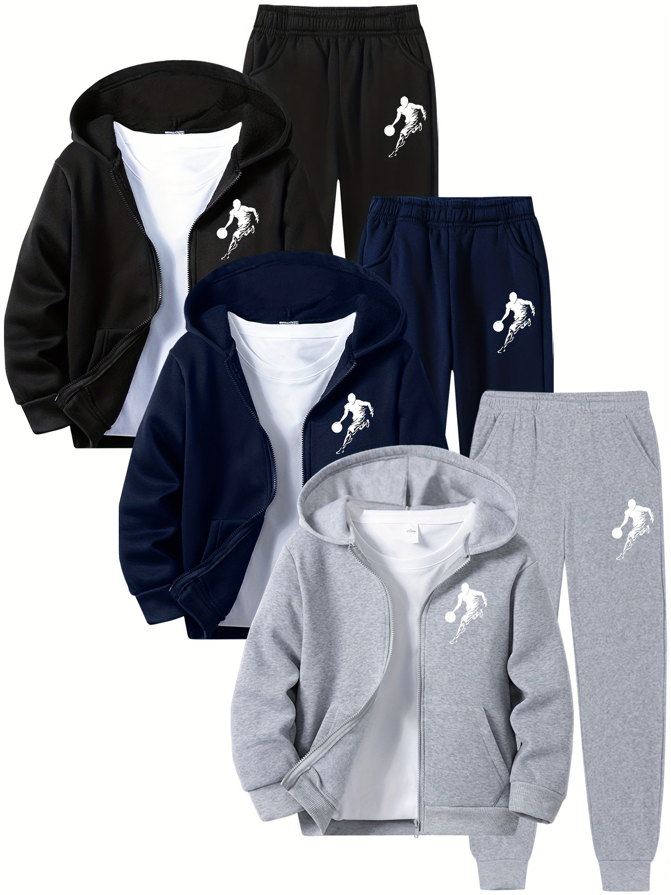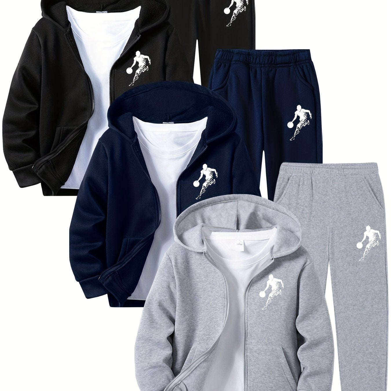 3 Sets Boy's Fleece Lining Long Sleeve Hooded Jacket & Loose Pants - Basketball Silhouette Pattern Print - Autumn Winter Outdoor Casual Outfits
