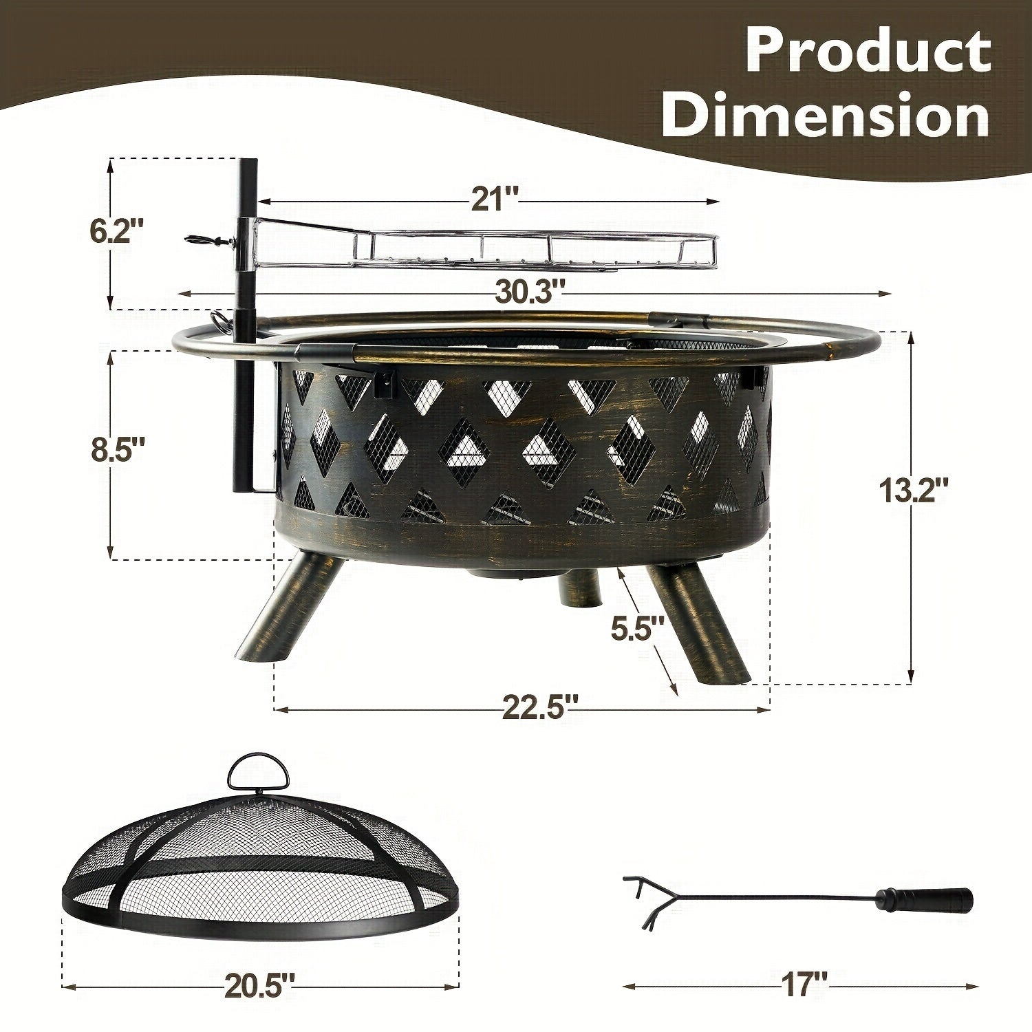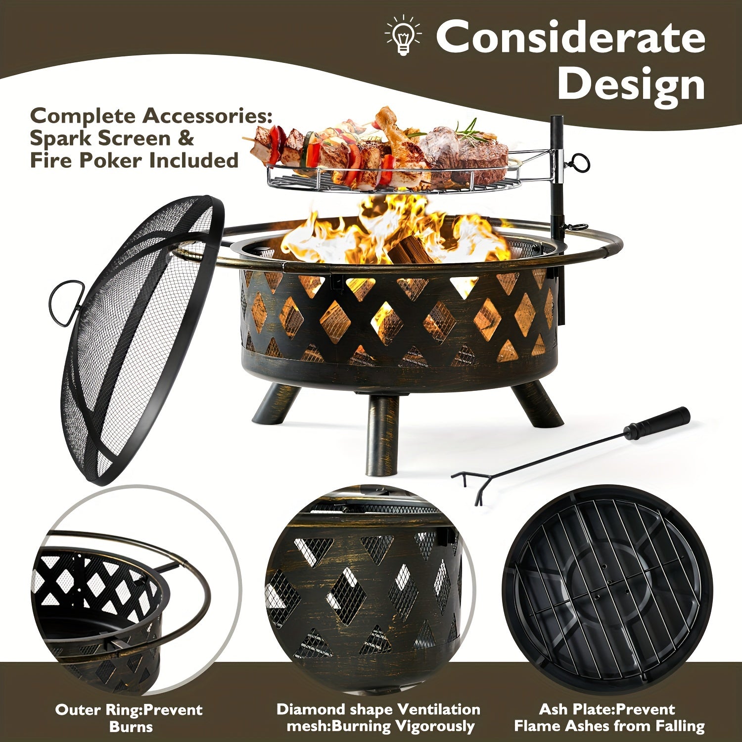 The 30-inch fire pit is equipped with a mesh cover to prevent sparks from flying, and the ring handle can effectively avoid burns and comes with a fire poker with a wooden handle