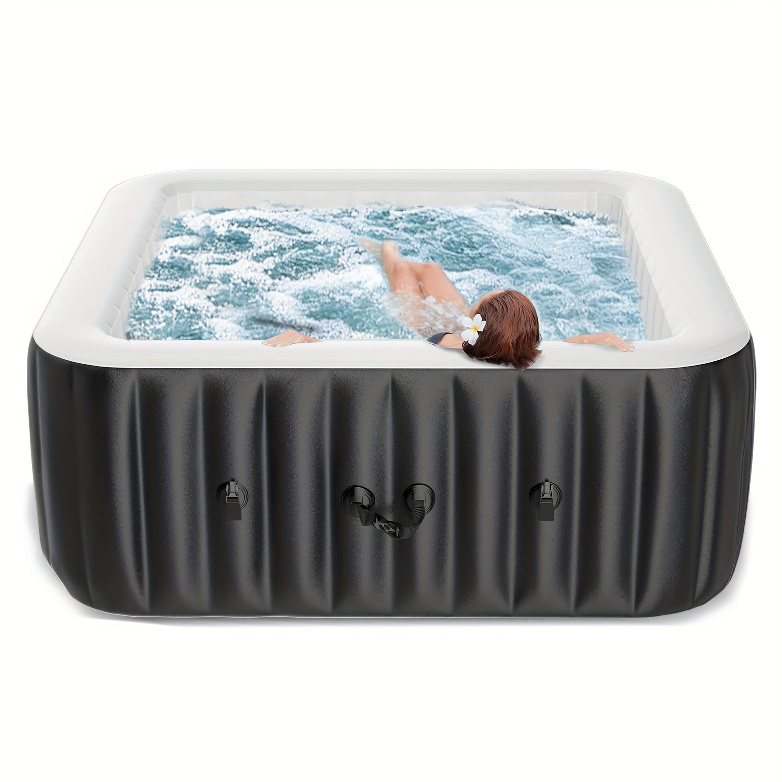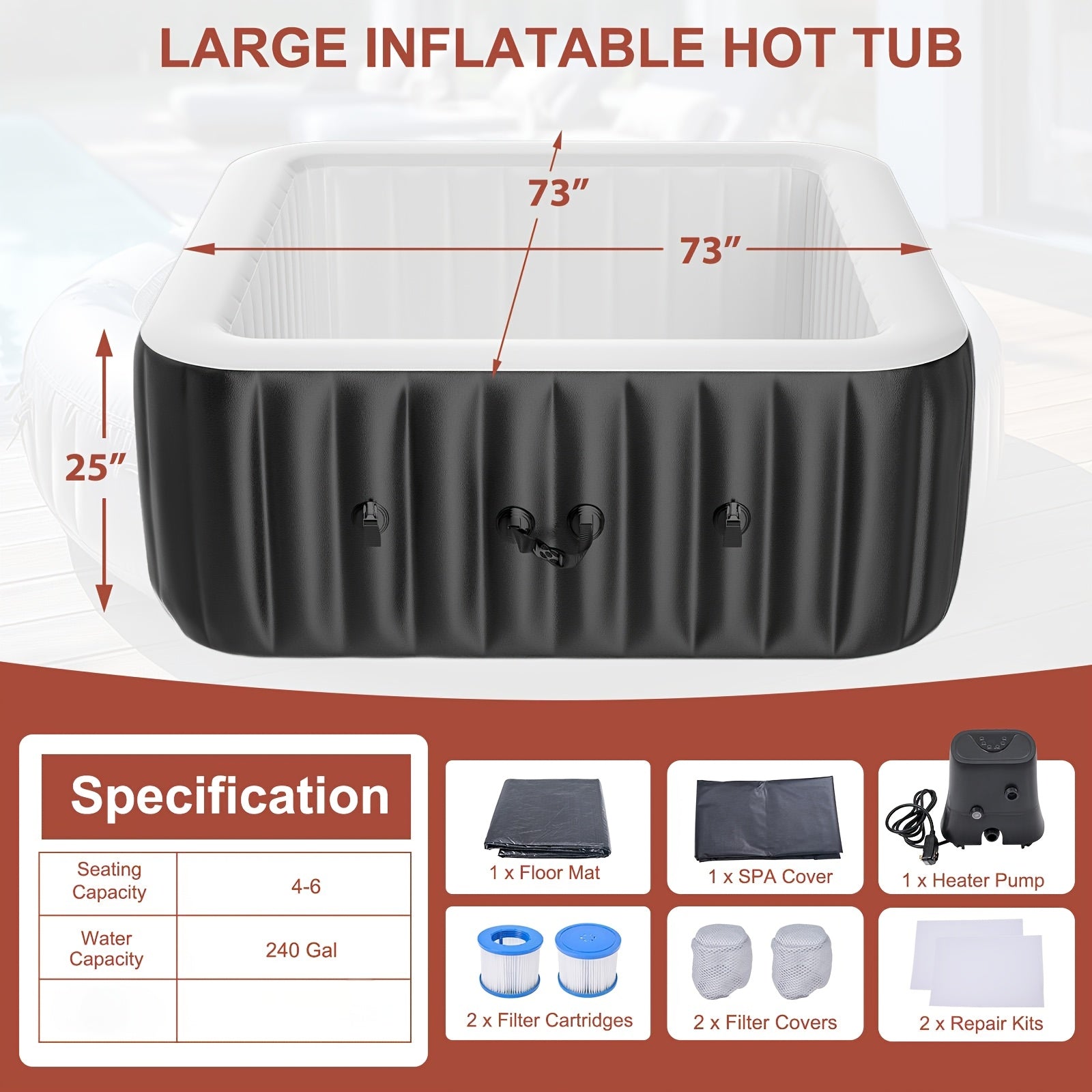 Experience relaxation and comfort with this spacious inflatable hot tub, designed to accommodate 4 to 6 people. Measuring 73" x 73" x 25", this large square spa provides plenty of room to unwind. Equipped with 130 bubble jets, it delivers a soothing massage-like experience ideal for easing tension after a long day.