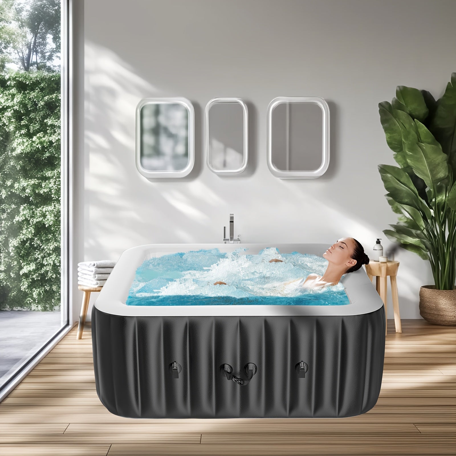 Crafted from durable plastic and featuring a convenient USB-powered system, this hot tub includes essential accessories such as a heater pump, filter, and protective spa cover to maintain cleanliness and water temperature.