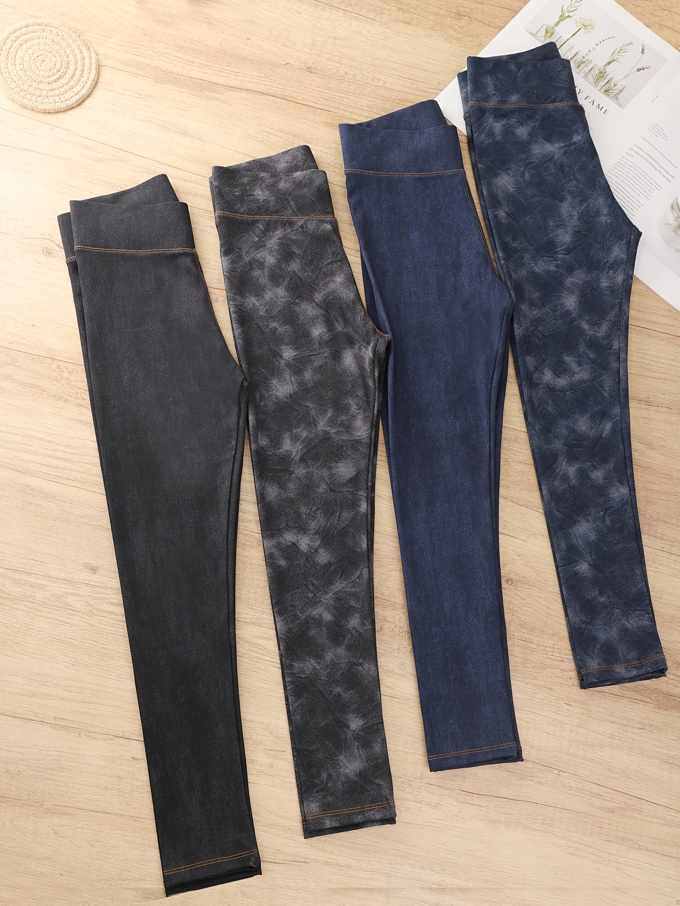 4pcs Girls Fashion Solid Color Snowflake Denim Print Leggings - Girls Aged 5-14.