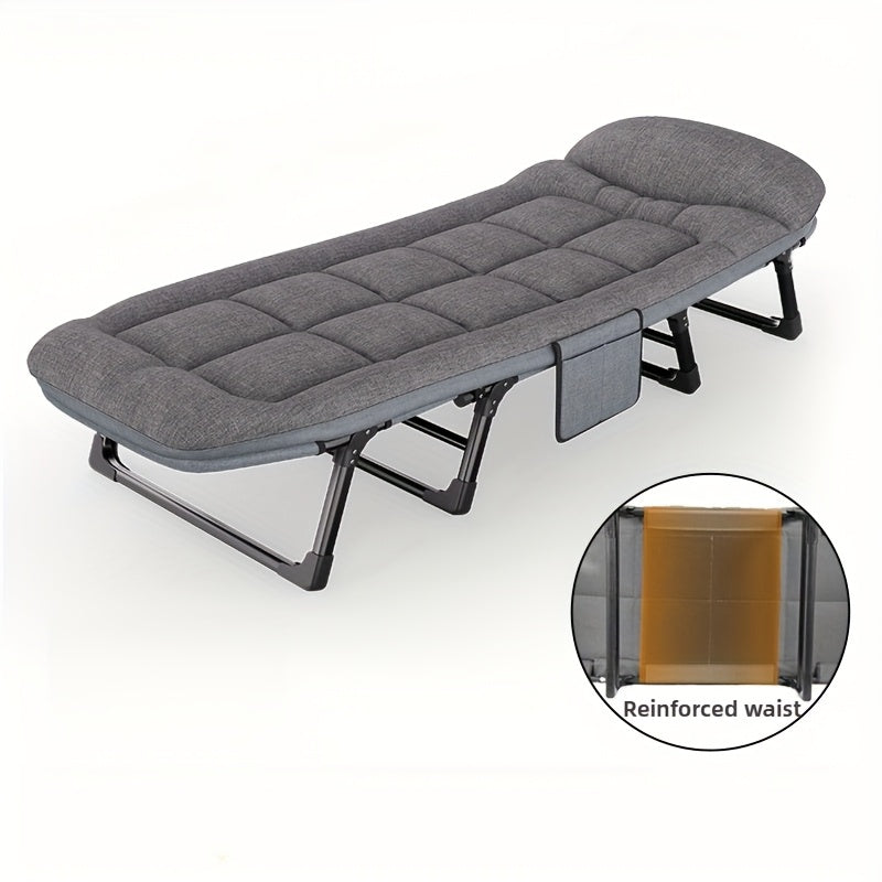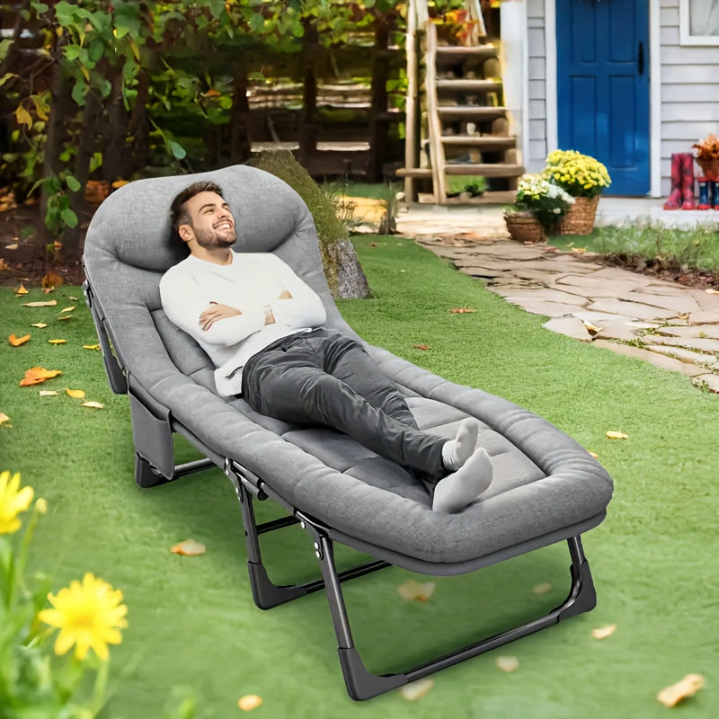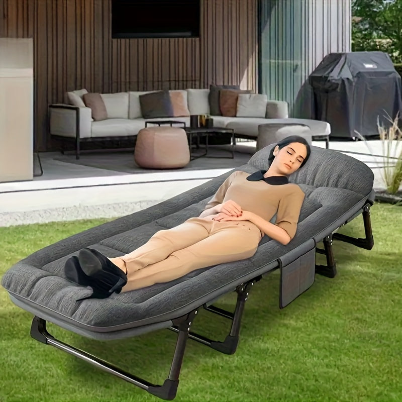 This 75-inch adjustable folding bed offers a portable and comfortable sleeping solution for camping, outdoor activities, or occasional indoor use. Featuring a sturdy painted metal frame and breathable fabric, it is designed for durability and comfort. The included cotton-filled mattress and pillow provide a cozy resting surface, while the solid back style offers stable support.