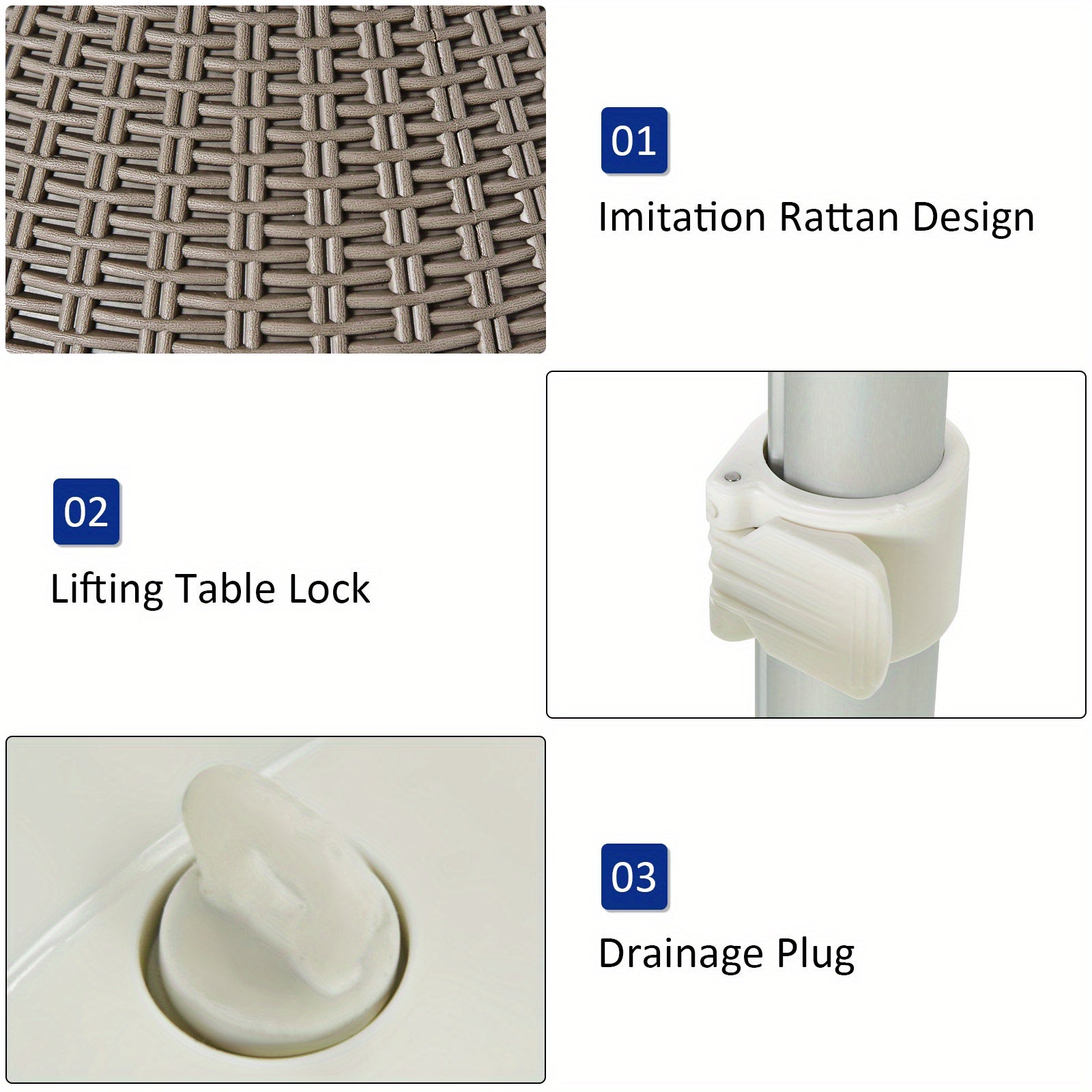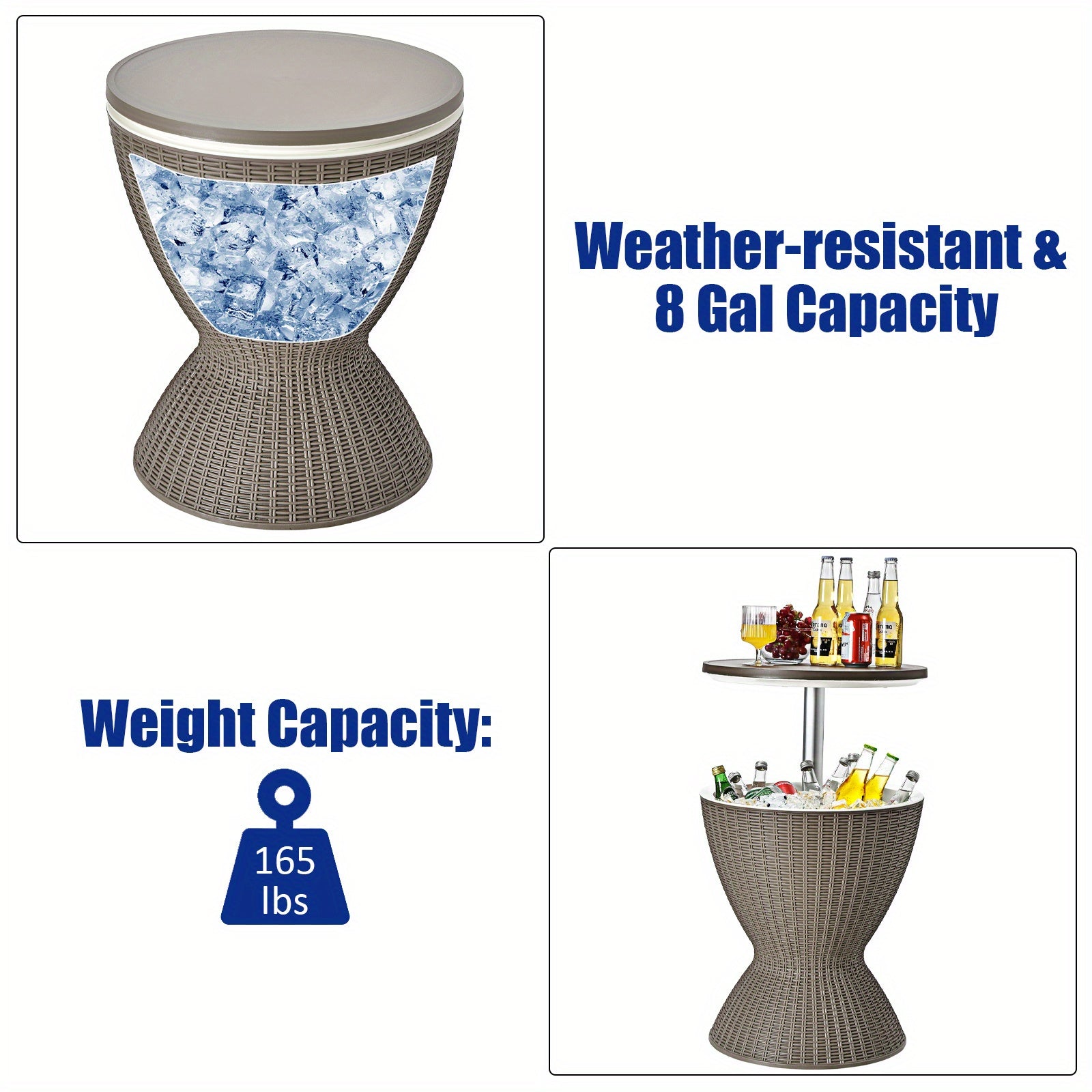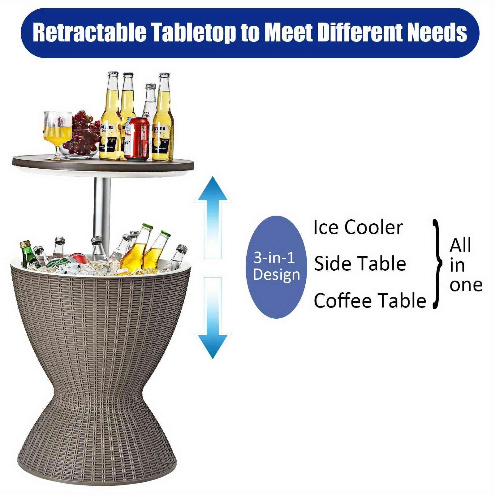 The knob securely fastens the foldable tabletop. It can be adjusted between 22.5” and 32.5” with flexibility. This versatile piece can be used as a side table for the patio or as an ice bucket. It has an 8-gallon capacity to hold various drinks and snacks. For easy cleaning and emptying, there is a drainage hole with a plug. The all-weather ice bucket features an imitation rattan design. Perfect for pool parties, barbecues, camping, and more. The inner container is also easy to clean with a damp cloth.