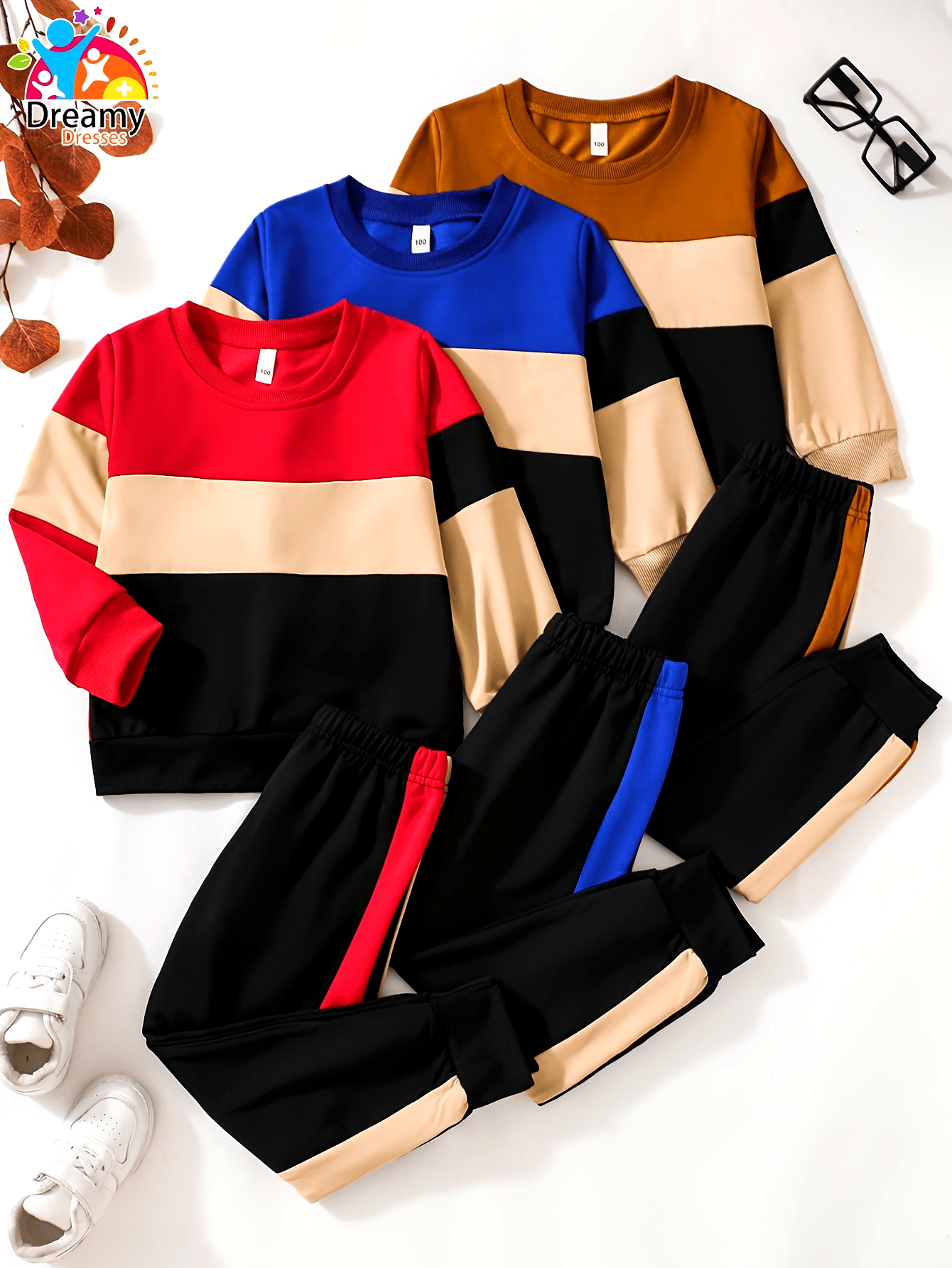 Boy's Casual 3 Sets, Fashion Comfy Round Neck Long Sleeve Pullover Sweatshirt & Versatile Sweatpants, Triple Color Block Design, Ideal For Autumn And Winter Outdoor Wear