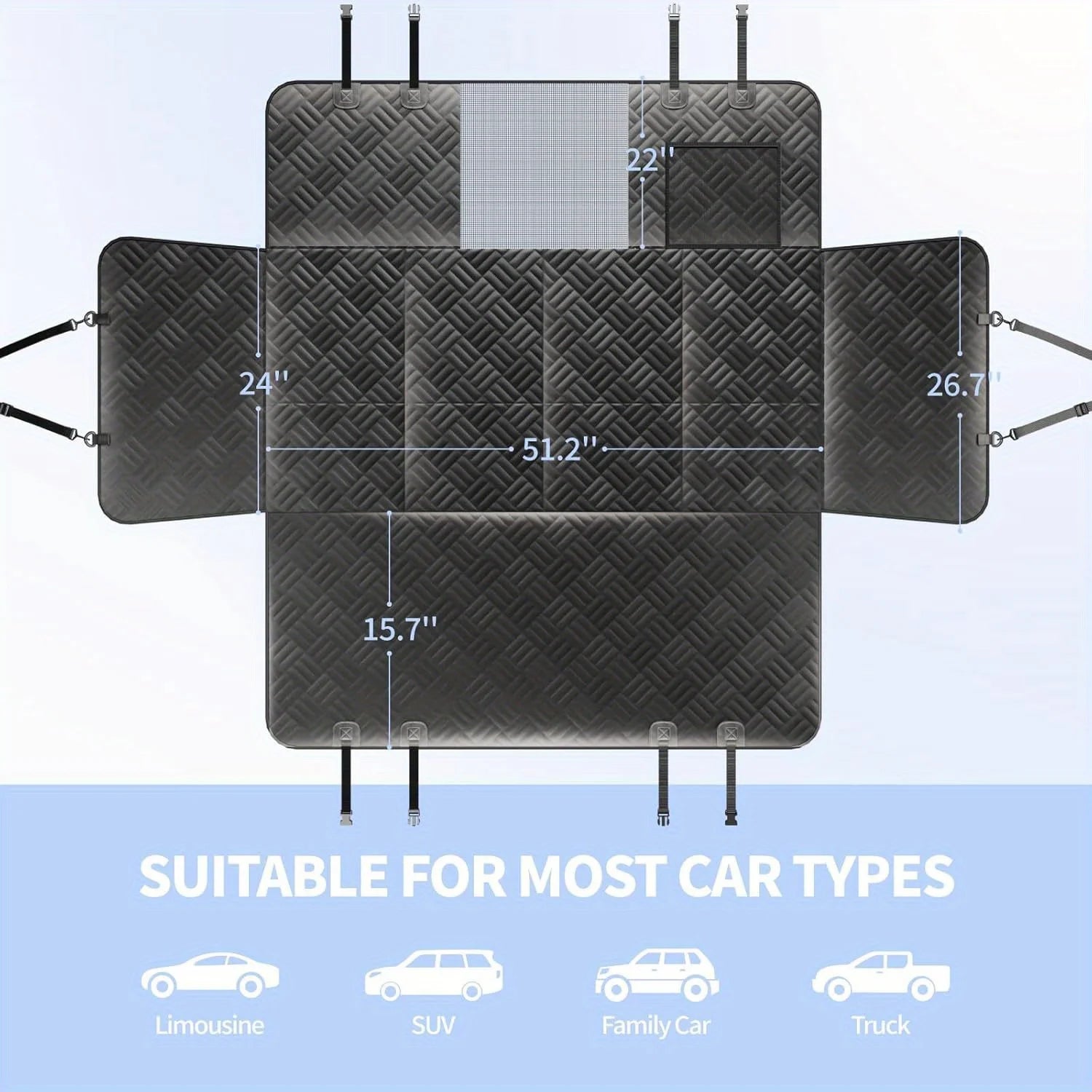 Upgrade your vehicle's back seat into a comfortable and secure space for your pet with this military-grade dog car seat cover and extender. Designed to significantly increase your dog’s space by 40%, this hard-bottom seat extender offers superior support and stability, preventing your pet from falling during car rides. With its durable construction and easy setup, it’s an essential travel companion for any pet owner.