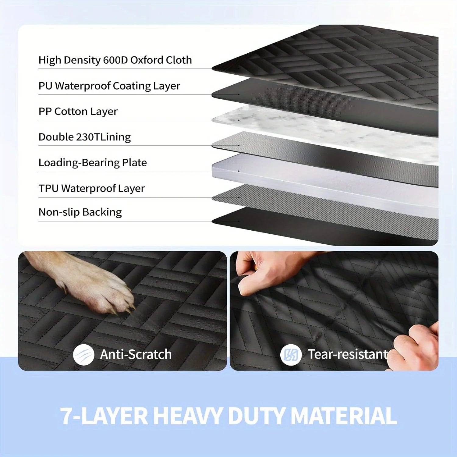 Made from heavy-duty, waterproof 600D oxford fabric with non-slip silicone backing and tightly stitched edges for enhanced scratch resistance and long-lasting durability