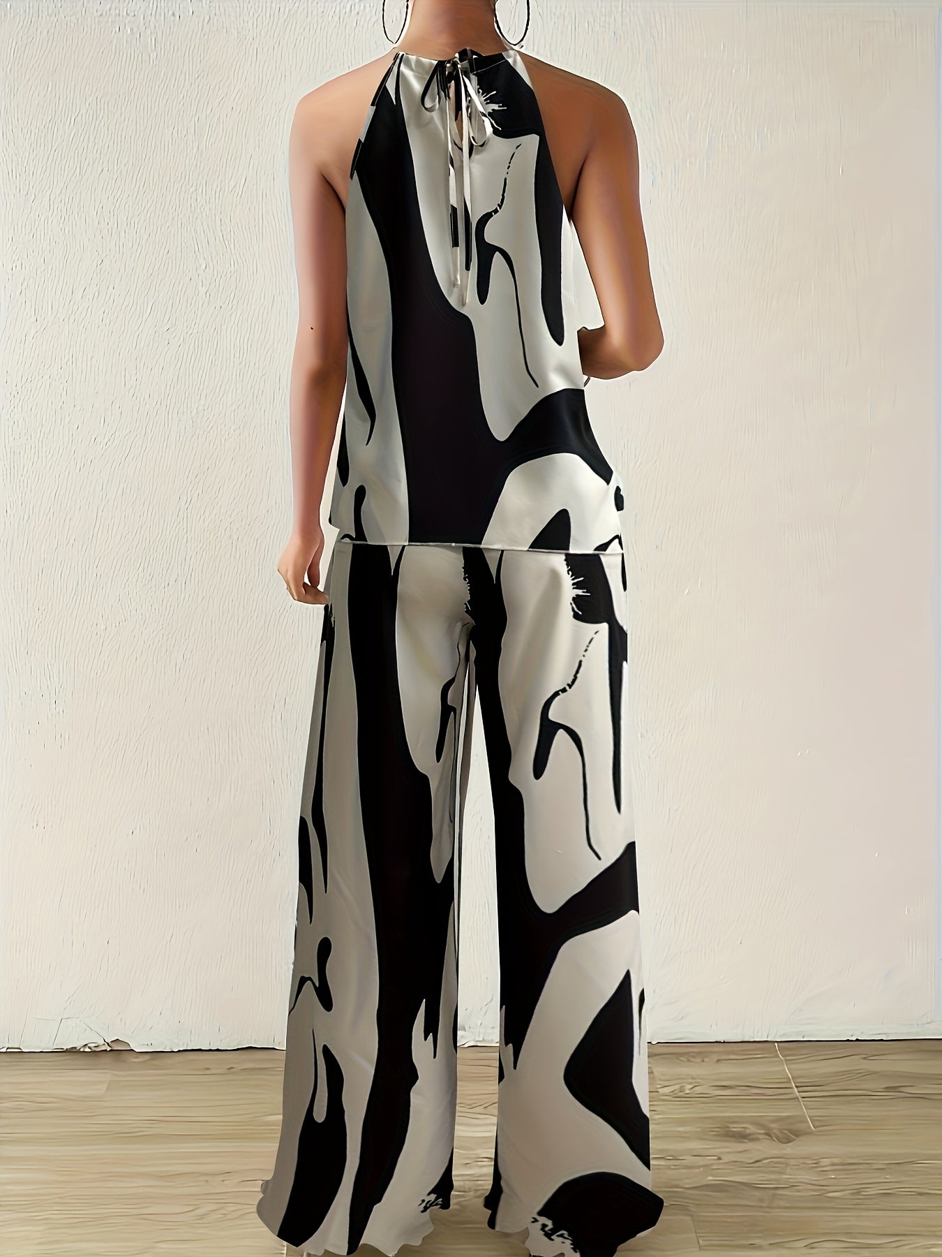 Elegant Vacation Style Open Neck Sleeveless Lace Up Top And Pants | For Spring And Summer, Printed | Polyester Spandex Blend