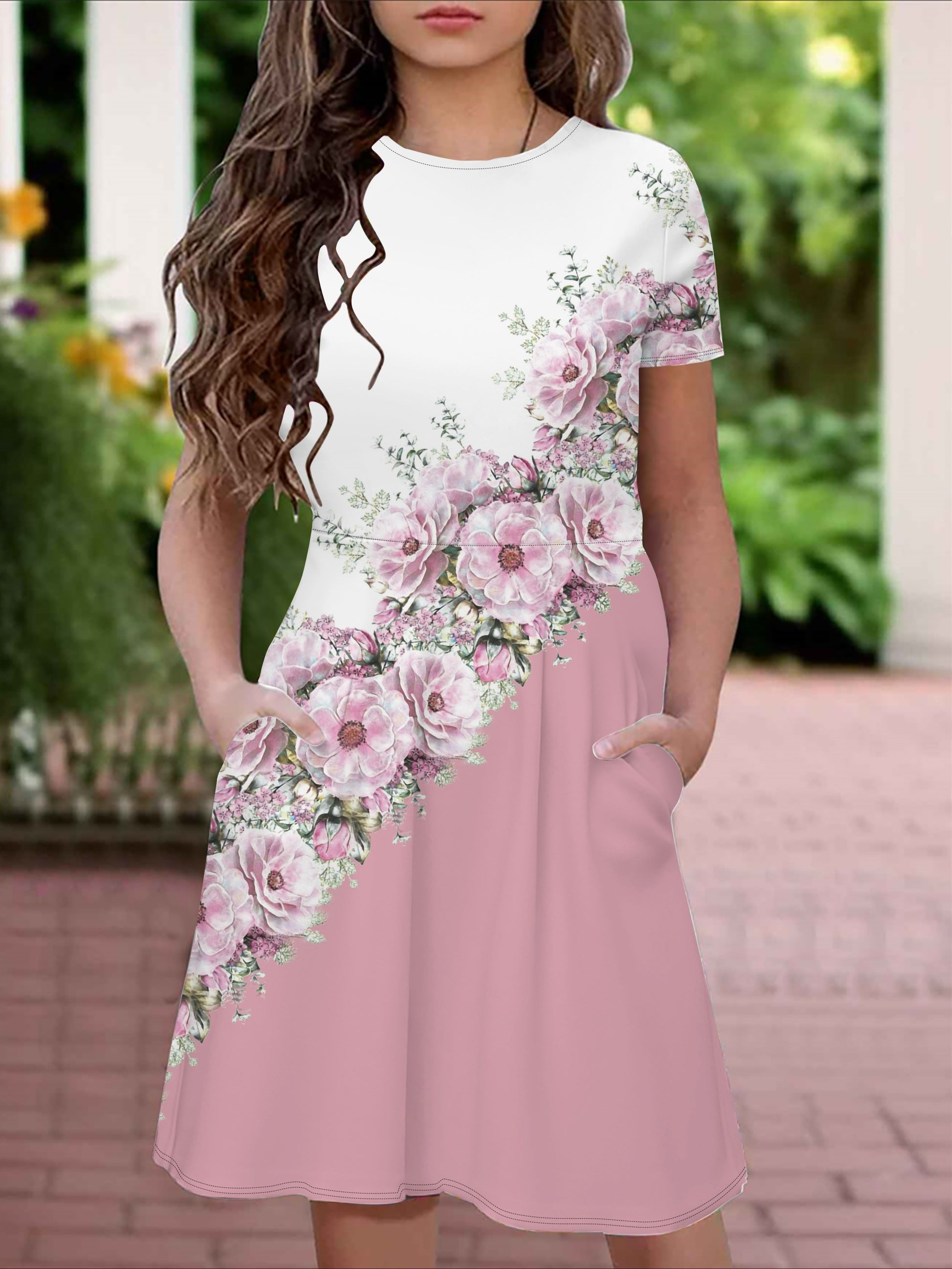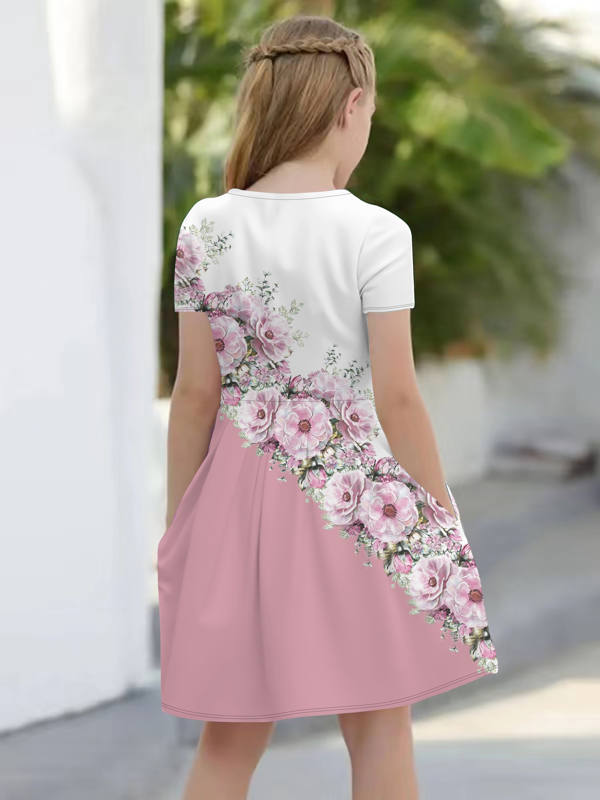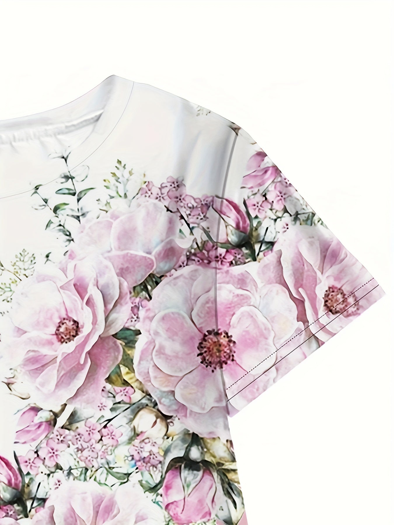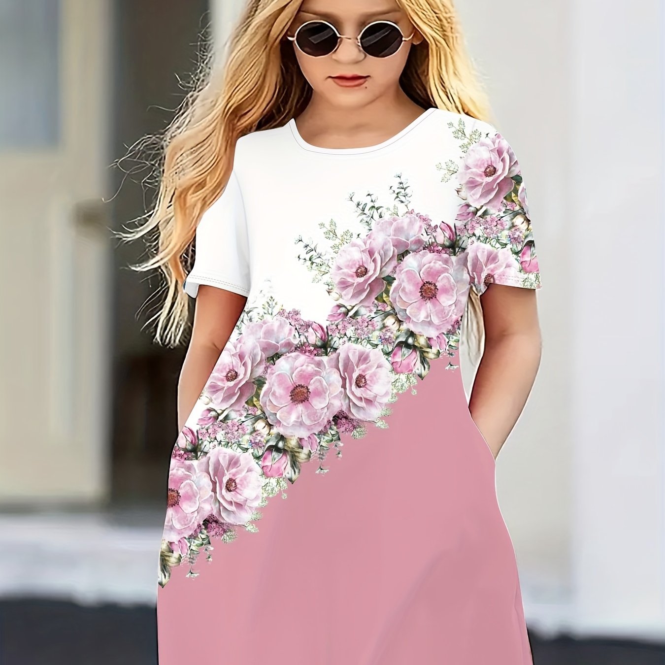 Loose Comfy Rose Flower Splicing Print Girl's Active Casual T-Shirt Dress for Holiday Summer Outdoor
