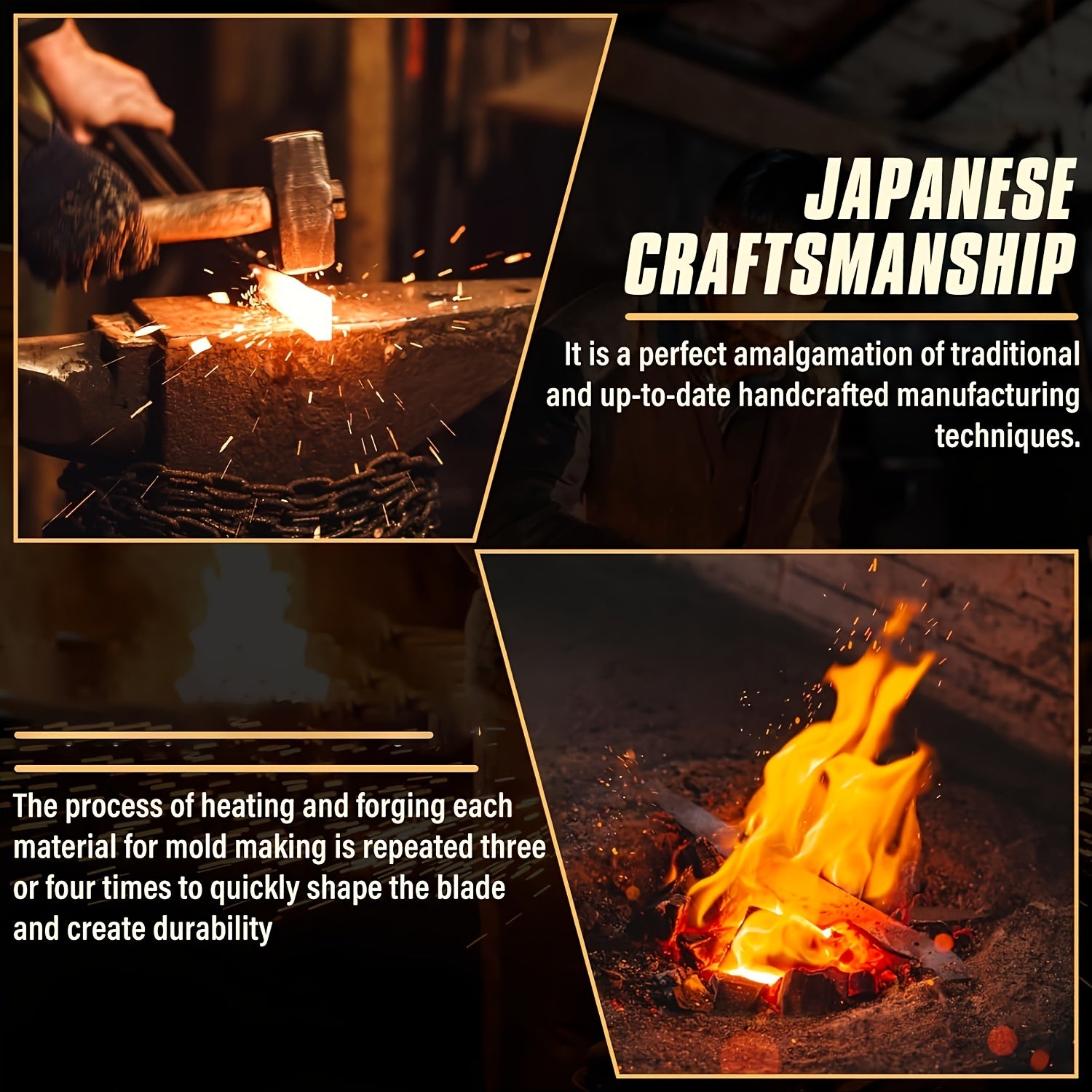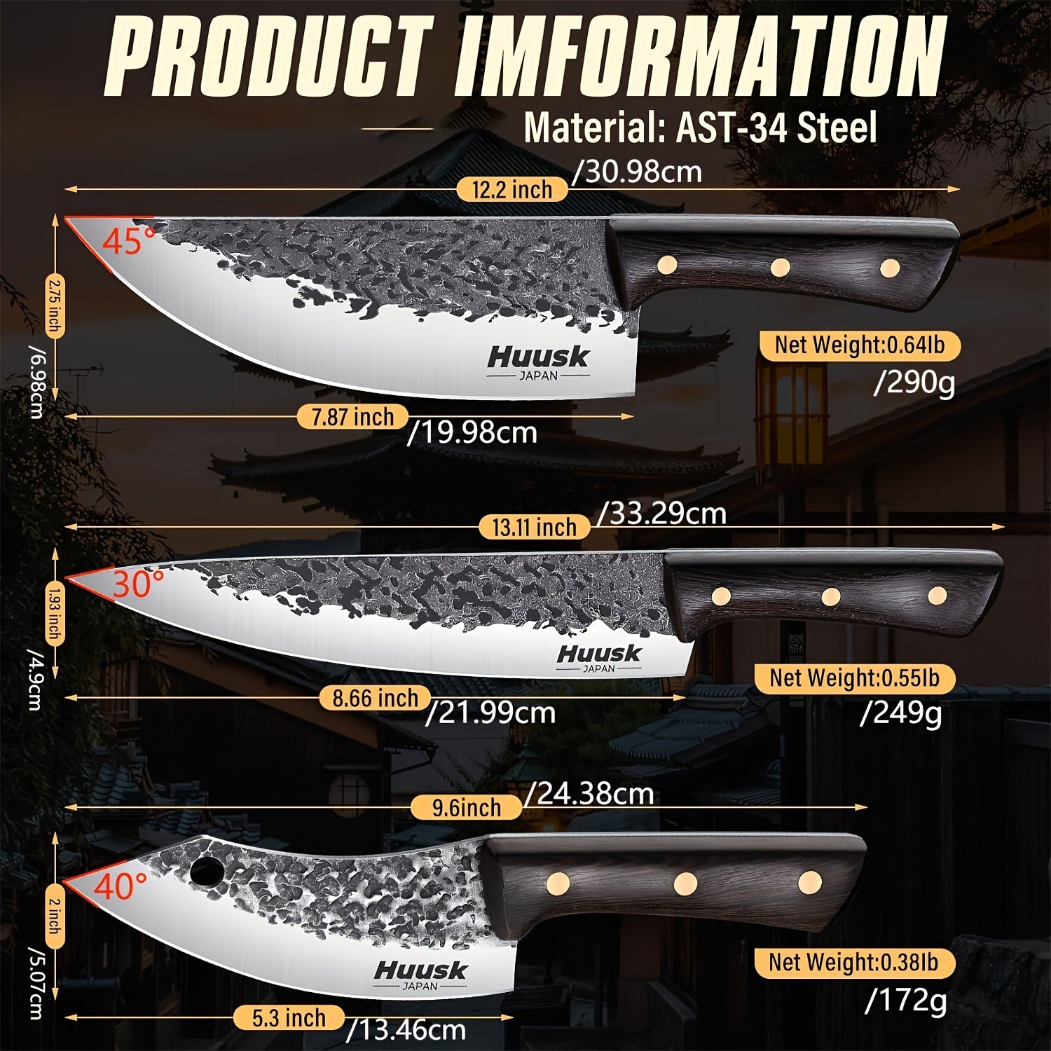 【HUUSK Knives Set】 The Butcher Knife Set Include: 7.8" Butcher Meat Cleaver, 8" Japanese Chef Knife, 5.3" BBQ Knife. In The Making Of Our Huusk Knives From Japan, The Blacksmiths Have Used High-carbon Steel ATS-34. From The Heat Treatment, Forging, And Sharpening Edge, To Assembling, Each Step Is Permeated With The Intention And Dedication Of The Skilled Craftsman. This Makes Our HUUSK Meat Knife Set Harder And Sharper Than Other Cutlery Sets.