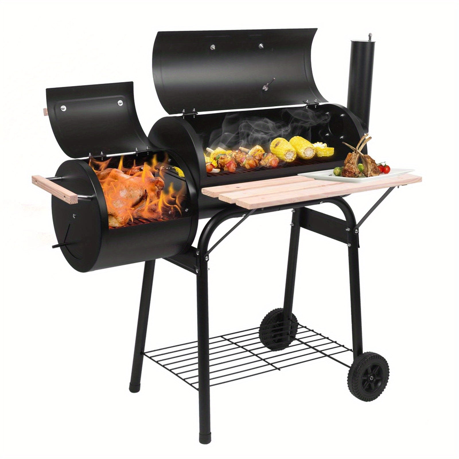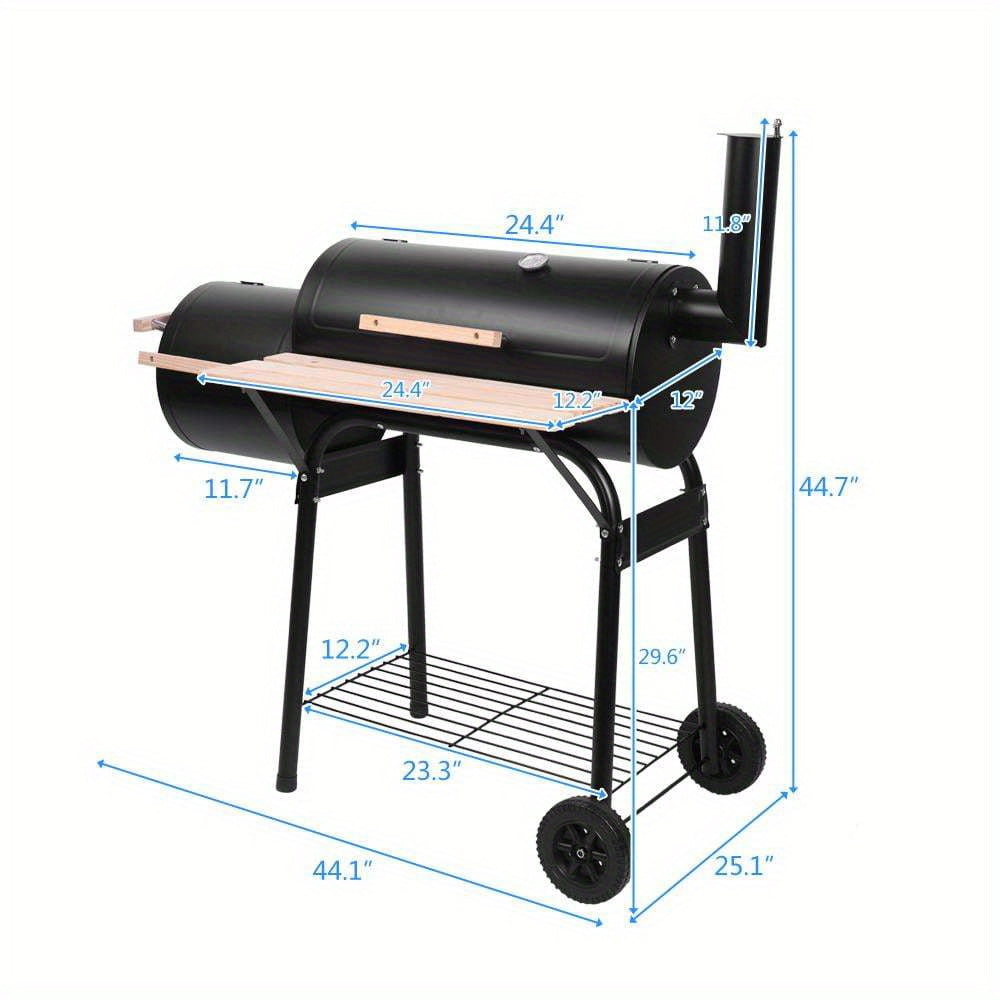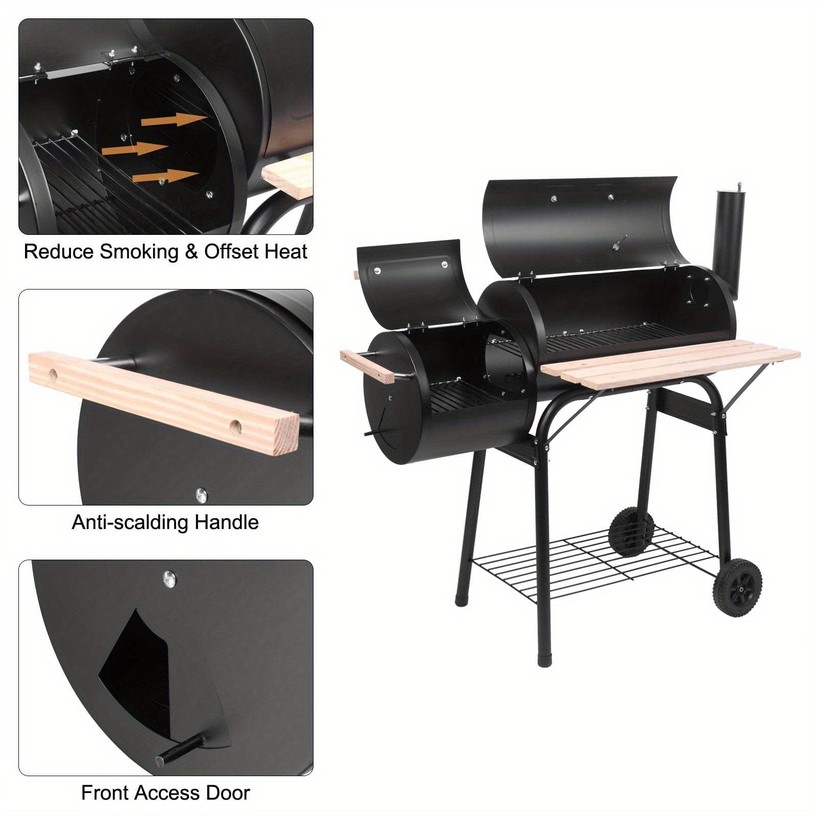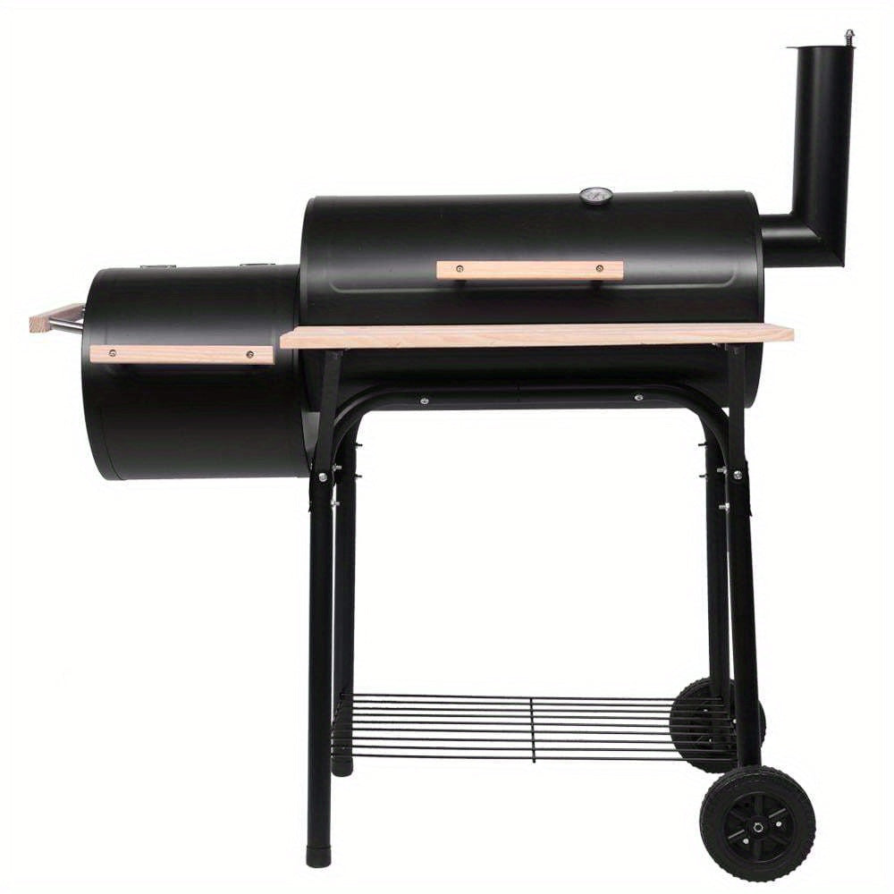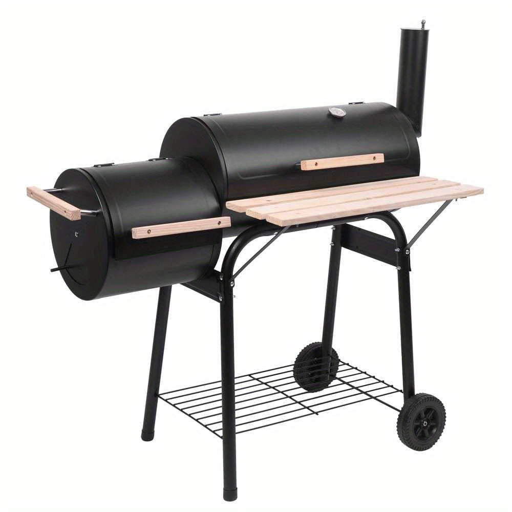 Heavy-Duty Portable BBQ Grill and Offset Smoker - Large Cooking Area, Built-in Temperature Monitor, with Caster Wheels - Commercial/Residential Use - Black Steel Outdoor Grill for Backyard, Camping, Restaurants - Two-in-One Grill/Smoker Combo,