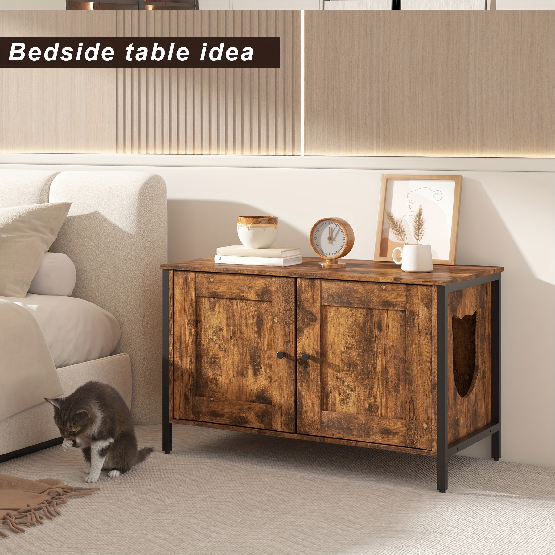 Vintage-Style Hidden Cat Litter Box Enclosure with Removable Divider – Rustic Wooden End Table Design, Spacious Cat Hideout & Food Storage, Fits Most Litter Boxes, Cat Litter Box Furniture