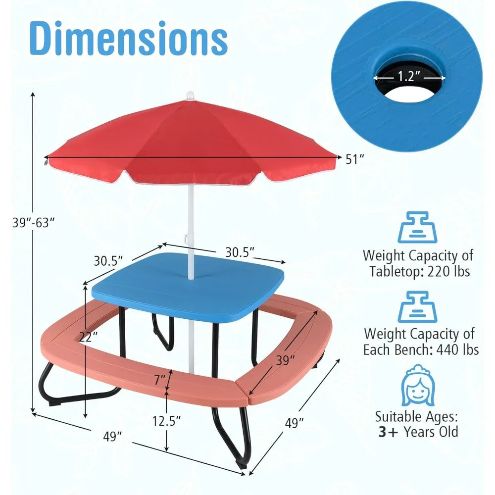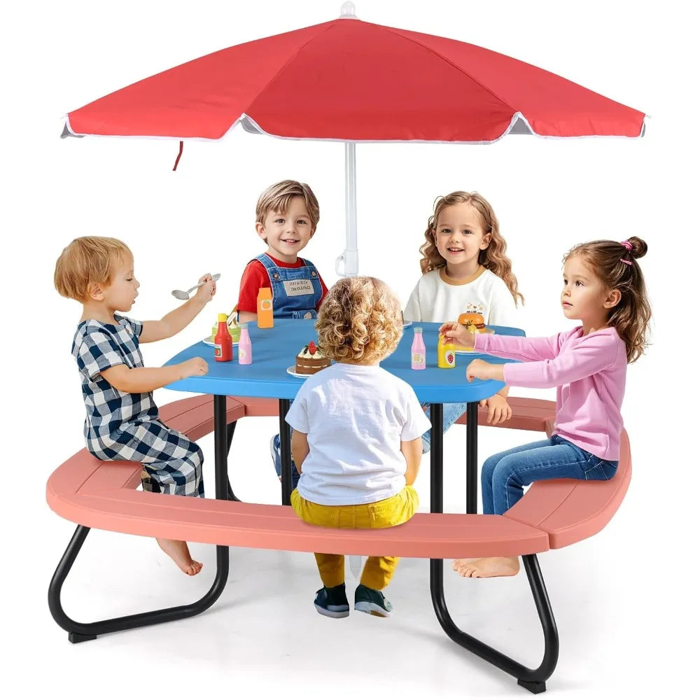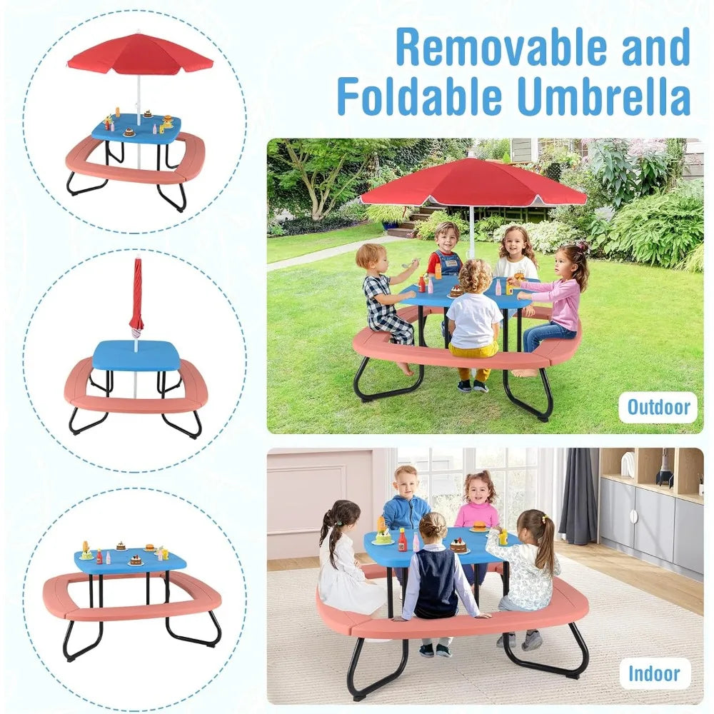 Kids Picnic Table Set with Umbrella and 4 Built-in Benches