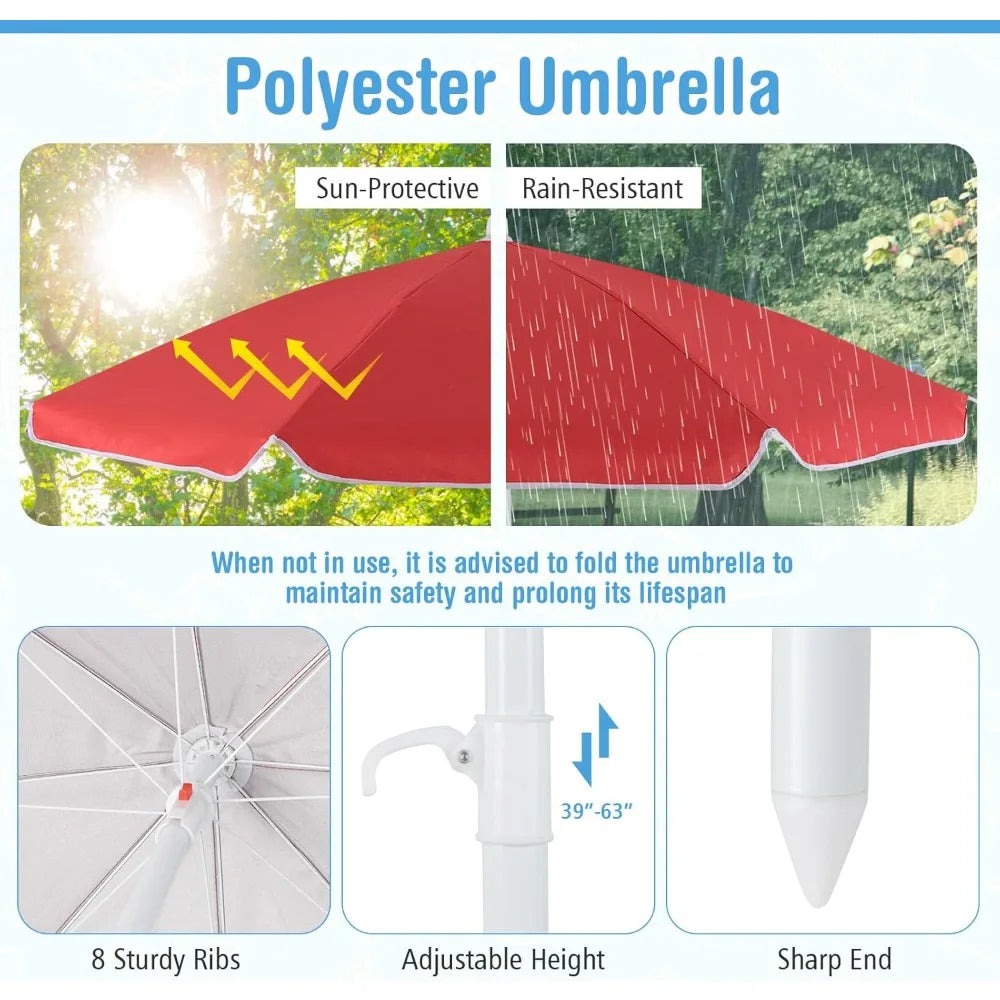 A removable, height-adjustable umbrella (39”–63”) offers protection from sun and rain, supported by 8 sturdy ribs and a pointed base for secure placement. The metal frame and comb-style construction provide superior stability, with non-slip foot pads for extra safety. Each bench supports up to 440 lbs., and the tabletop holds up to 220 lbs.