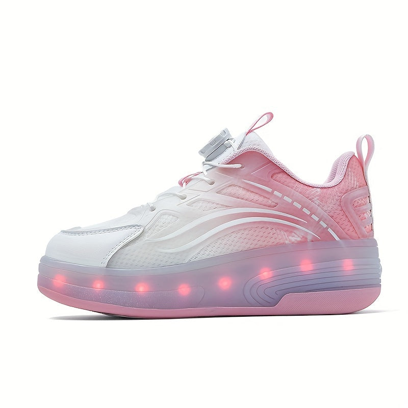 These LED light low top roller shoes combine fun, fashion, and functionality for active kids. Designed for indoor and outdoor use, they feature a breathable PU upper and fabric lining that keep feet comfortable in all seasons. The rotary buckle closure ensures a secure fit, while the round toe design adds extra comfort for growing feet.