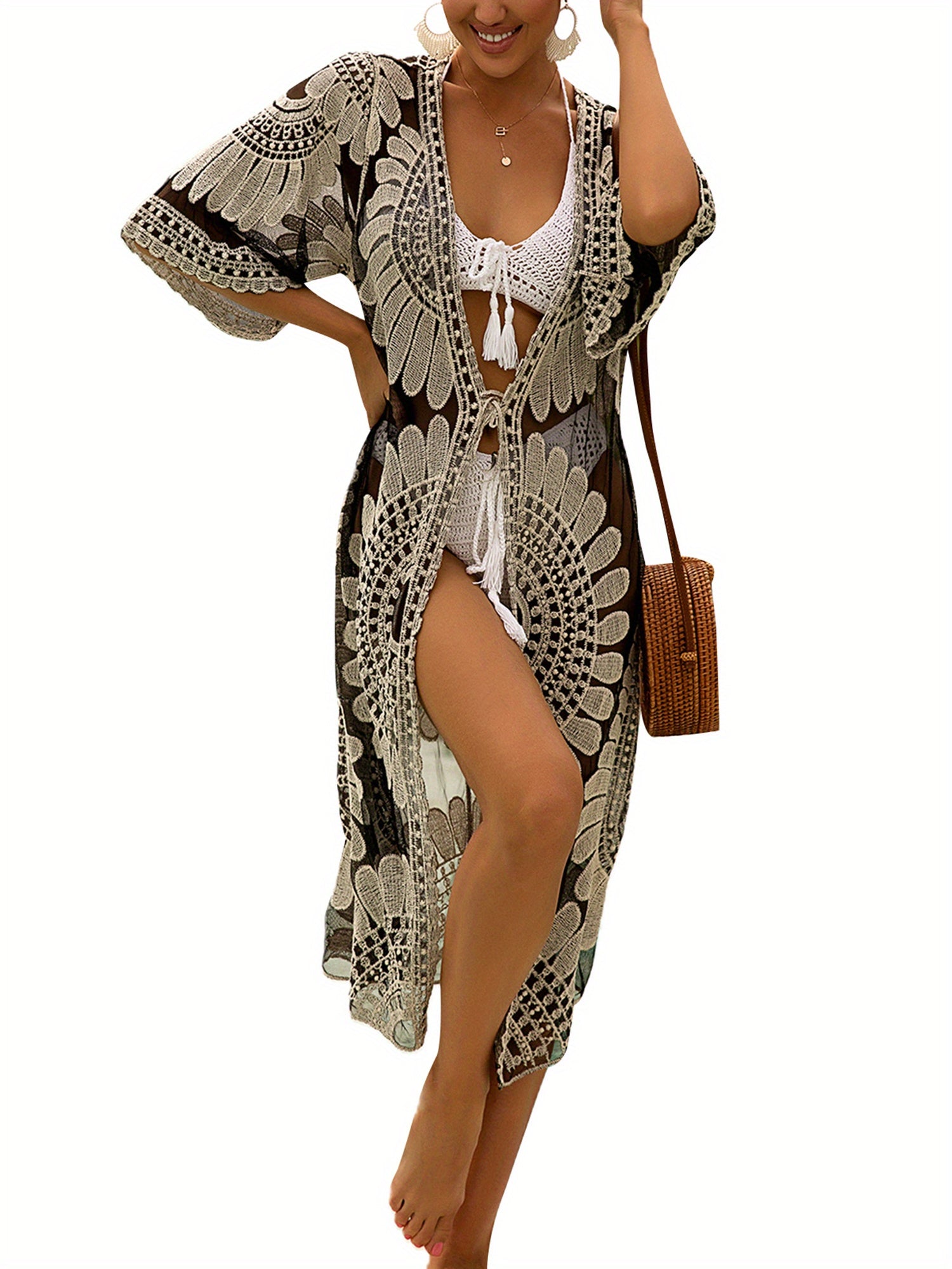 Elevate your beach style with this elegant floral crochet kimono. Crafted from 100% polyester with a slight stretch, this open-front cover-up features intricate embroidery and a flattering half-sleeve design. Its lightweight knit fabric drapes beautifully, offering a breezy, casual look that's perfect over swimwear.