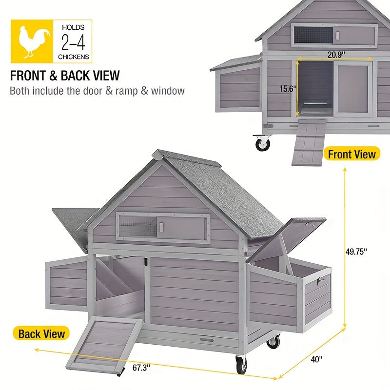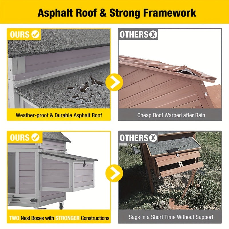 Movable Large Outdoor Chicken Coop - Wooden Hen House With Nesting Boxes, Asphalt Roof & Strong Framework On Wheels