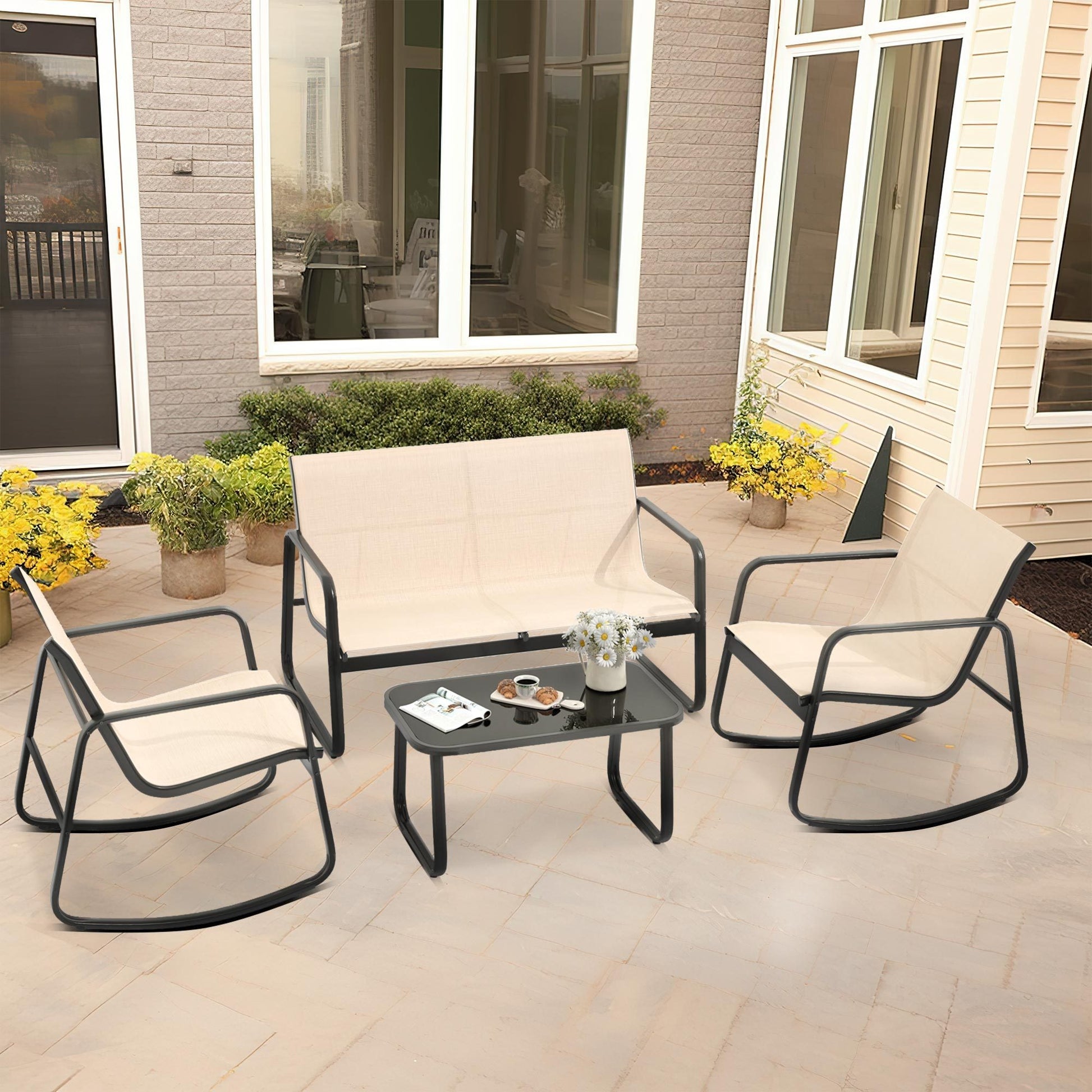 Patio Bistro Set: 4pcs Rocking Chairs, Glass Table.