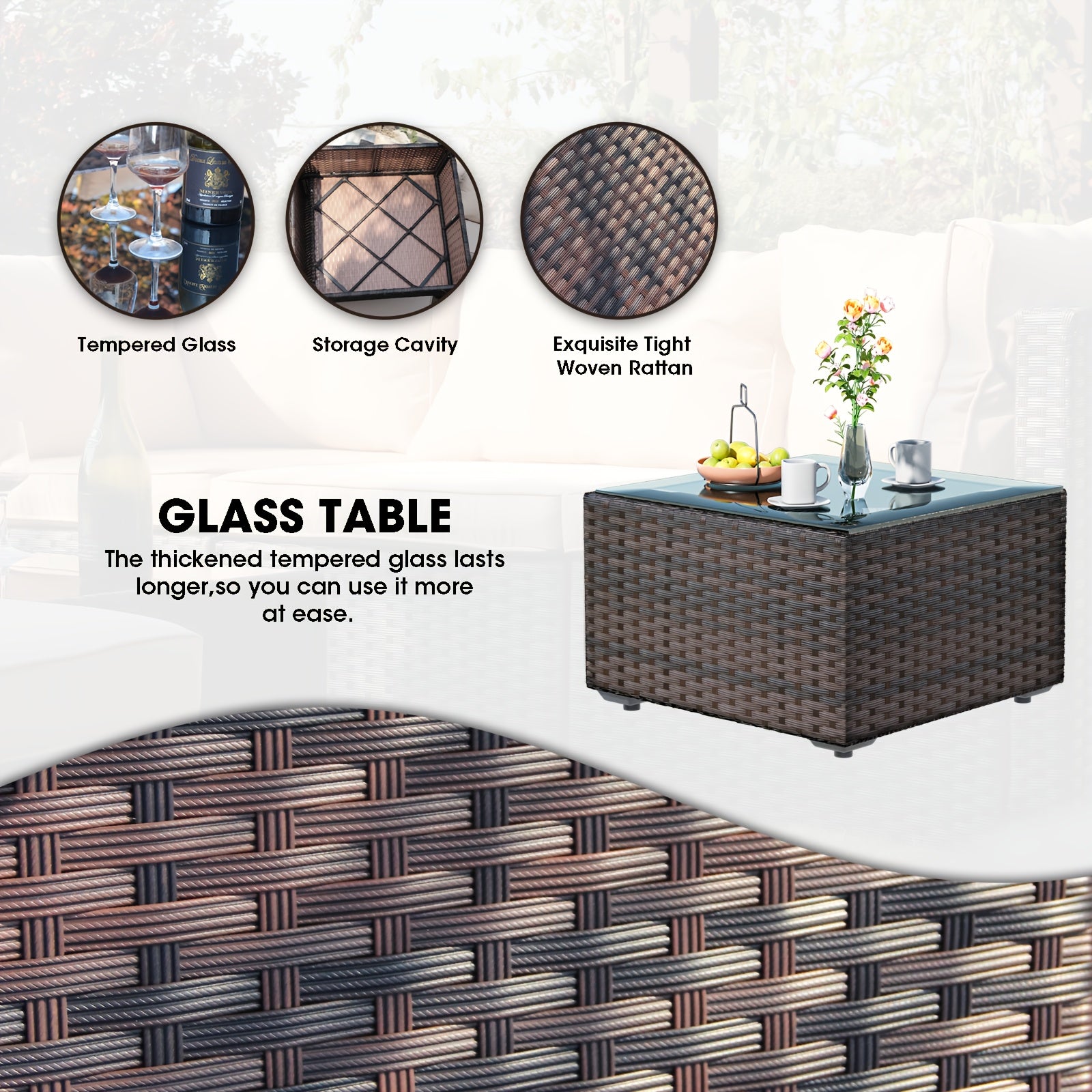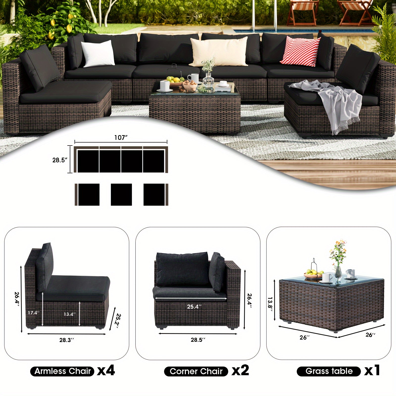 Includes 7 pieces: sectional seating and tempered glass coffee table