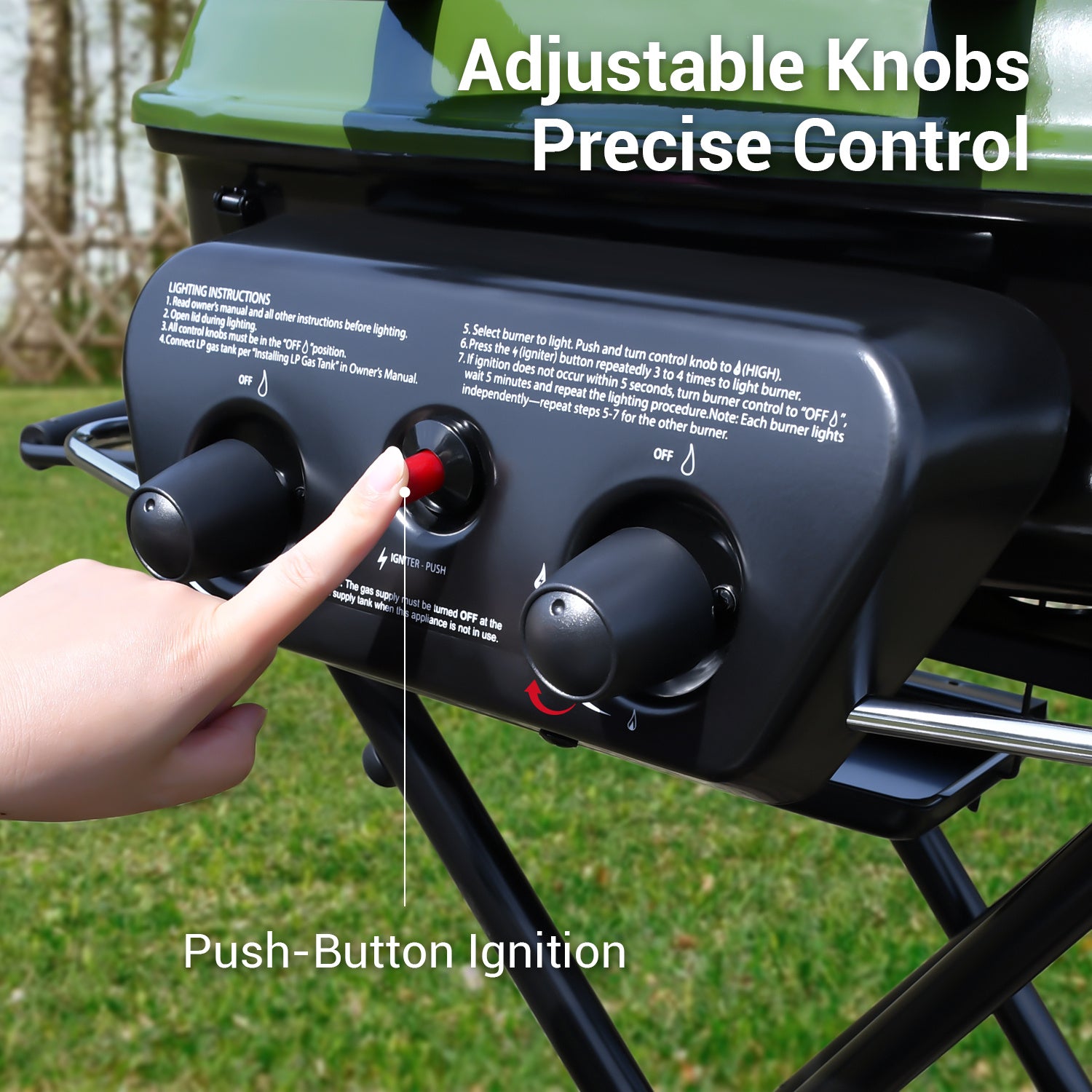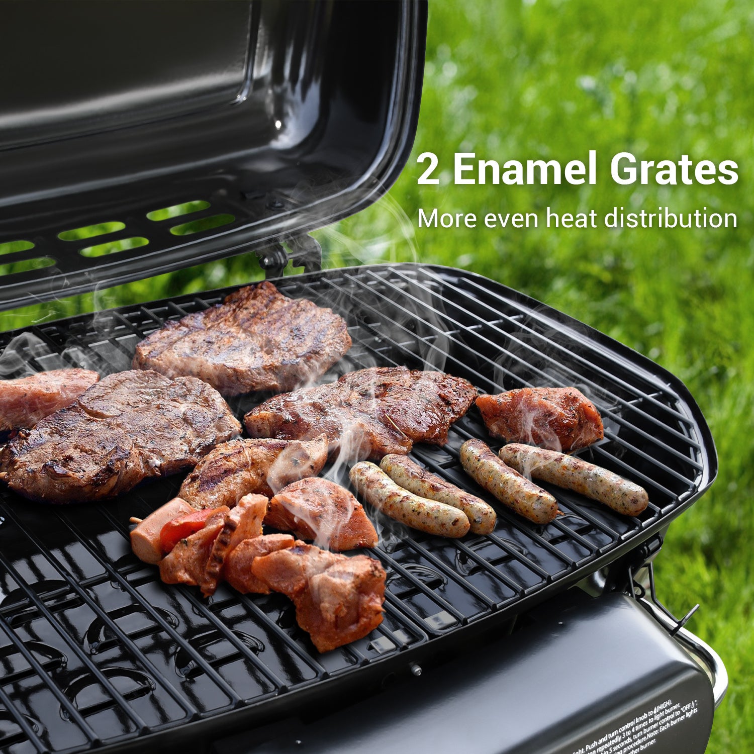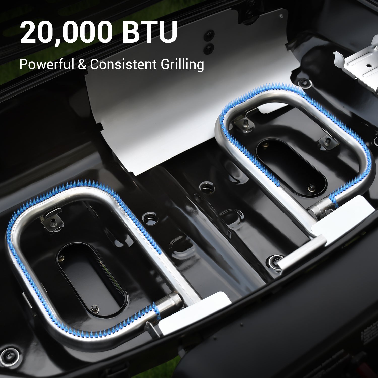 Take your outdoor cooking to the next level with this compact yet powerful 2-burner propane gas grill, ideal for camping, tailgating, backyard parties, and more. Delivering up to 20,000 BTUs of grilling power, it features an integrated ignition system for fast start-up and precise temperature control. The 338.5 square inch cooking surface and high-lid design provide ample space for multiple dishes, making it perfect for family or group meals.