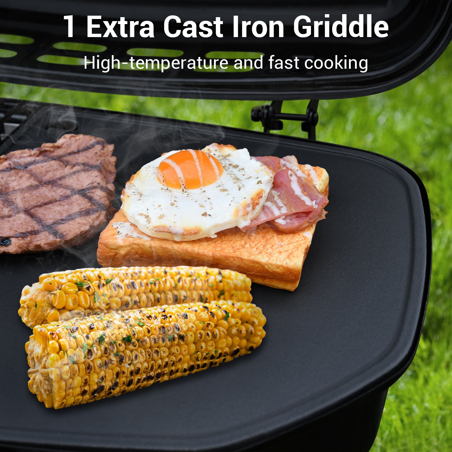Dual cast iron grates and griddle offer superior heat retention and even cooking