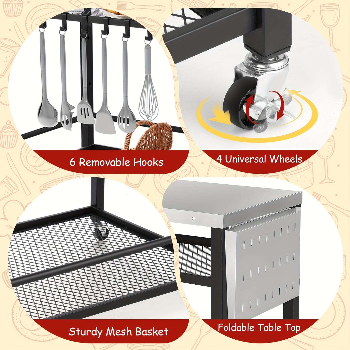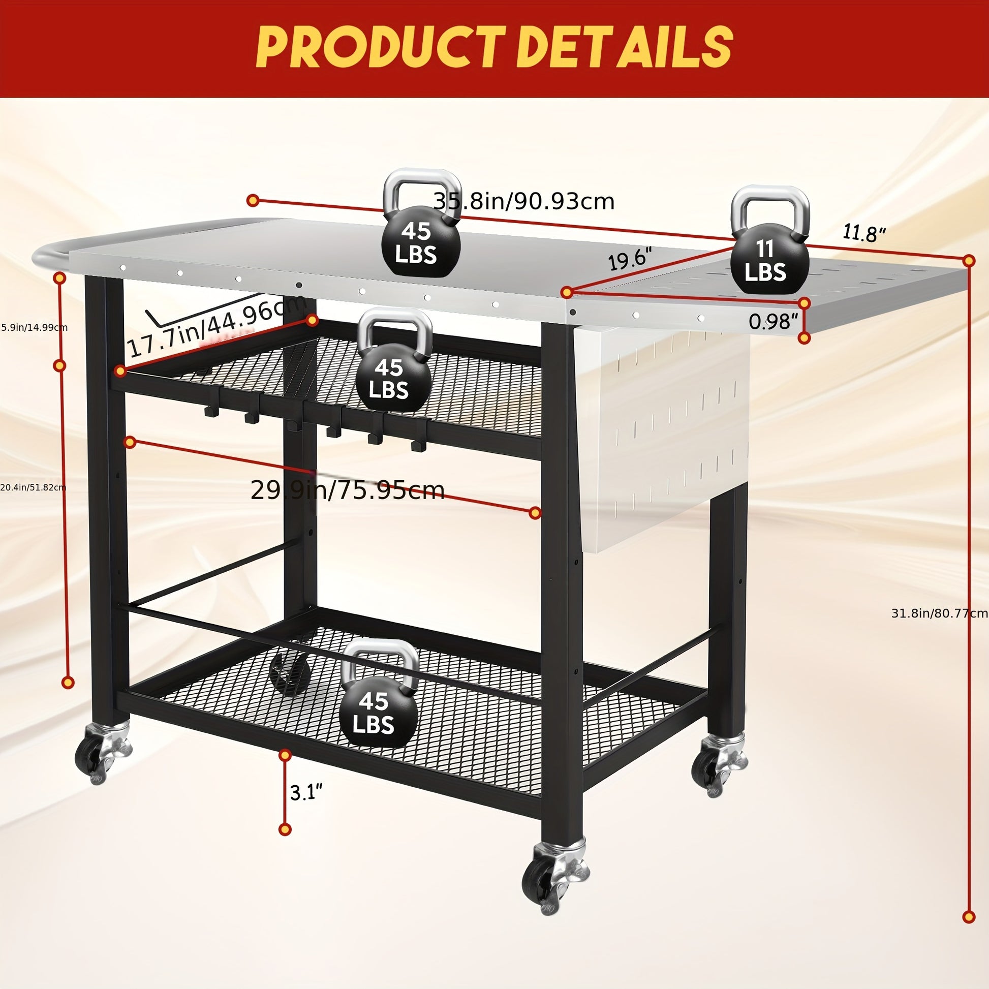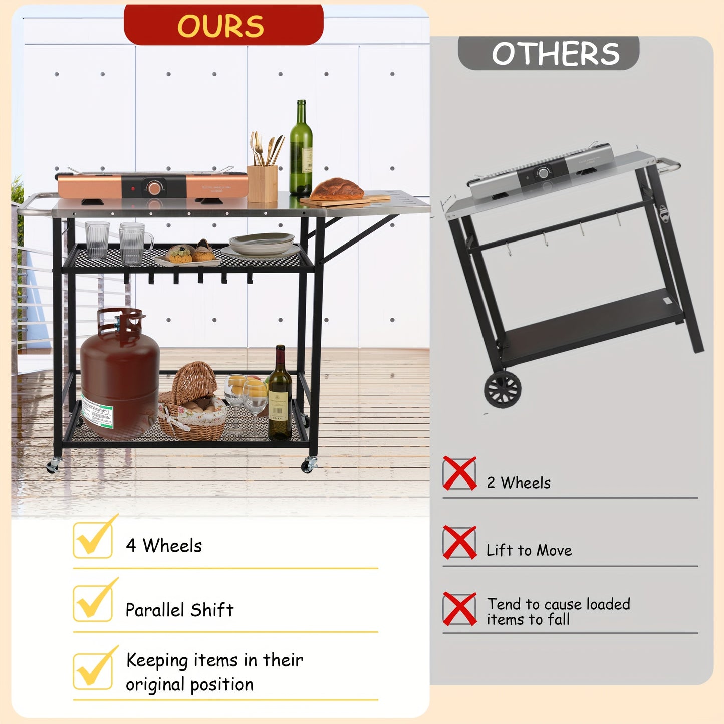 Outdoor Grill Cart Table With 4 Wheels, Movable Pizza Oven Stand Table With Foldable Side Table, 3-Shelf Outdoor Cooking Prep Table - Stainless Steel - For BBQ, Camping & Picnics - Ideal Gift for Outdoor Enthusiasts