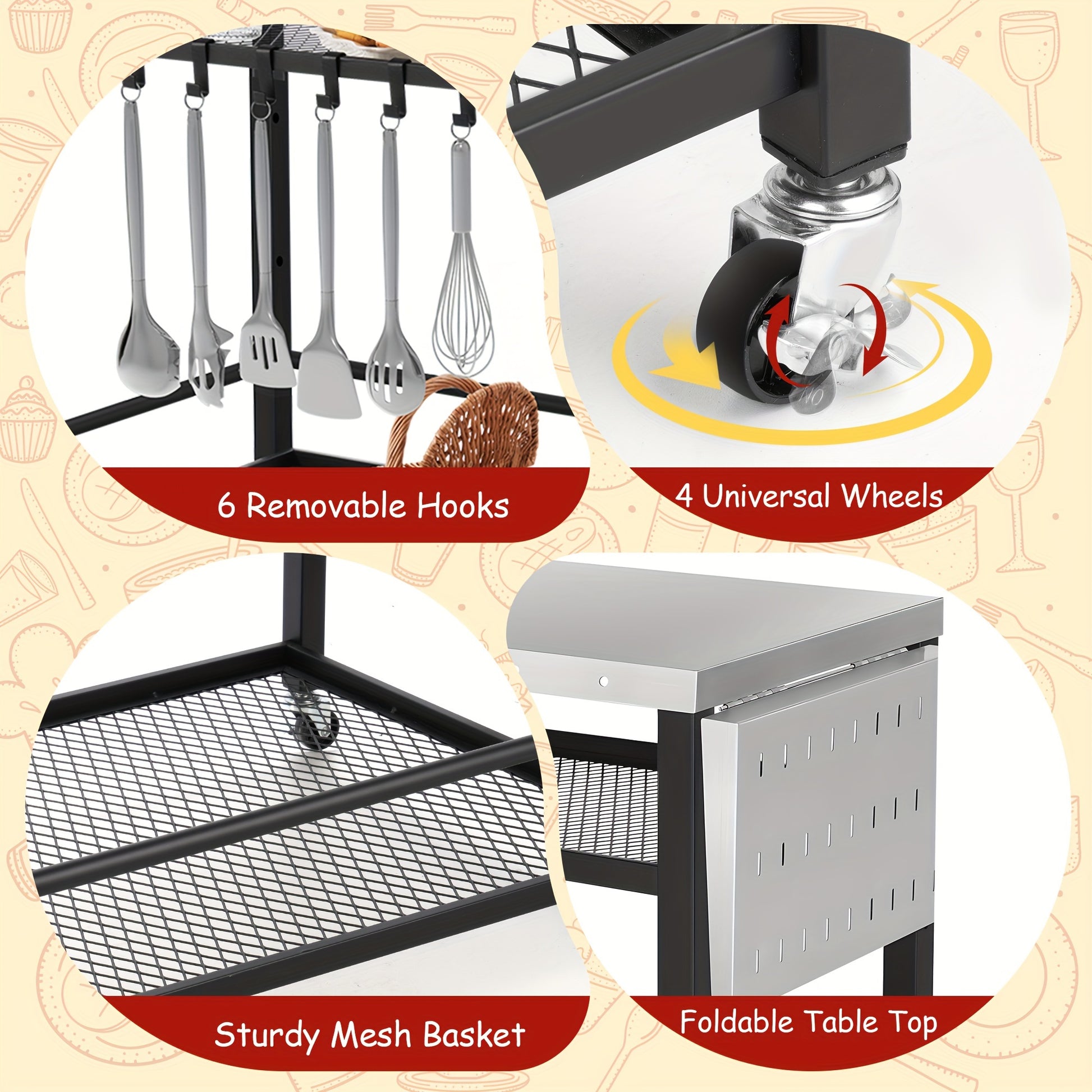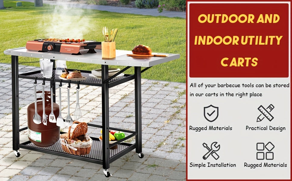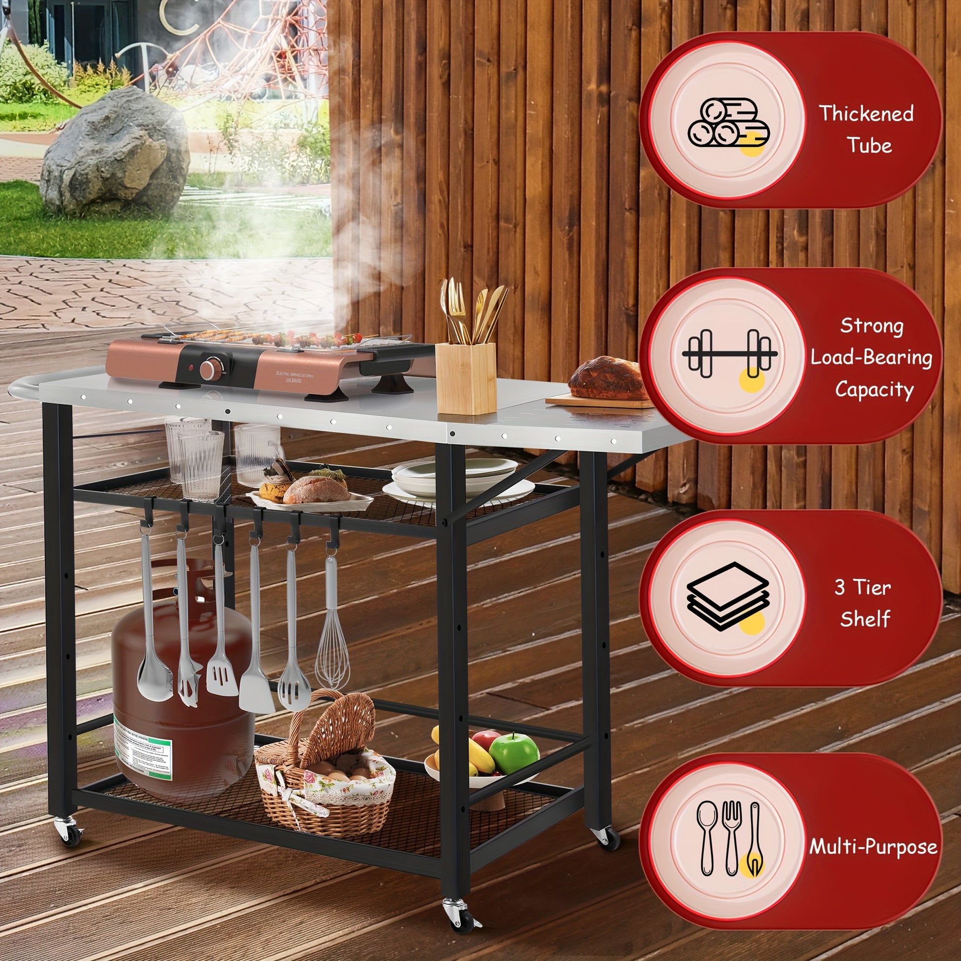 Outdoor Grill Cart Table W/ 4 Wheels, With Foldable Side Table, 3-Shelf Prep Table - For BBQ, Camping.