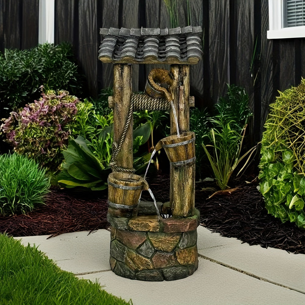 A realistic antique well fountain: Made of poly-resin and fiberglass, this charming water feature boasts a distinctive vintage appearance. With intricate elements like a gray pavilion roof, ropes, and buckets, it adds a natural touch to any environment. Perfect for enhancing the beauty of your outdoor spaces such as the backyard, garden, or patio.