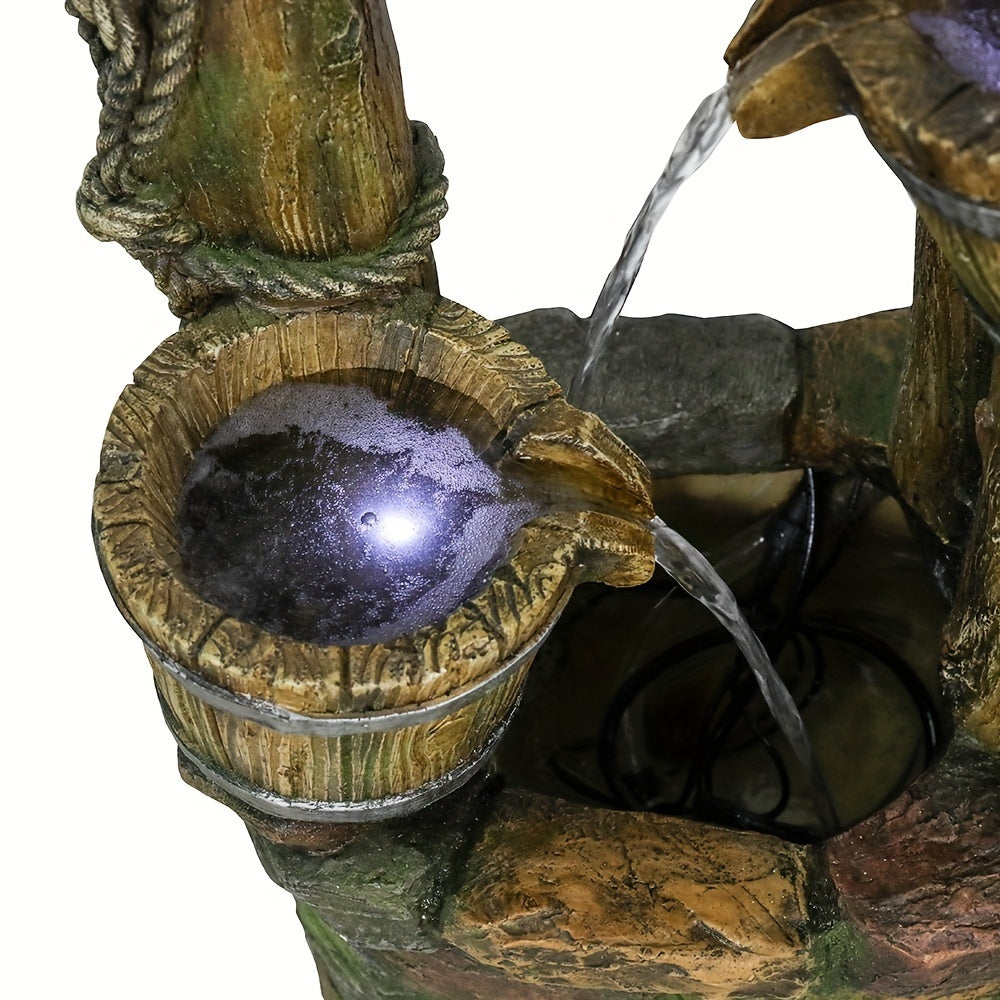 The tranquil atmosphere is enhanced by the gentle flow of water from the buckets into the illuminated 'well,' creating a calming and dramatic effect in your outdoor area.