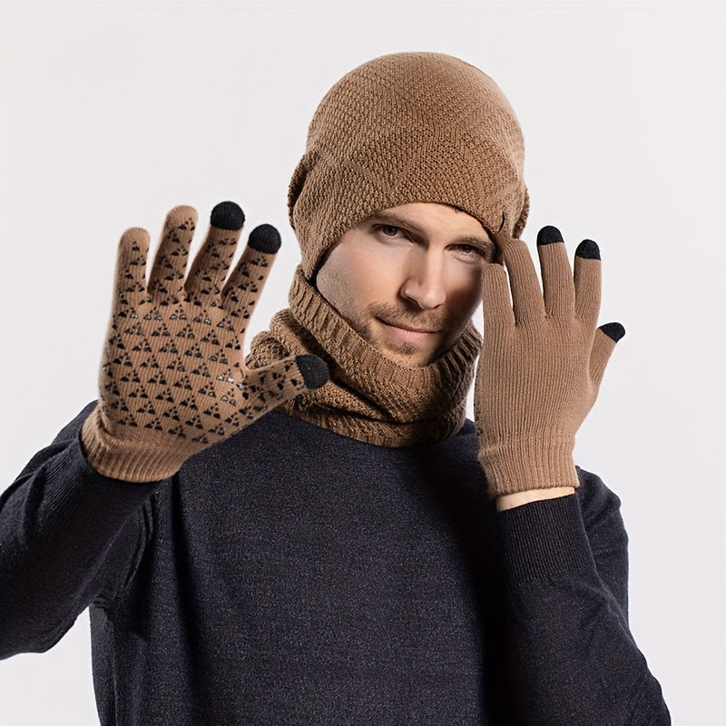 Men's outdoor 3 piece winter hat, gloves, scarf.