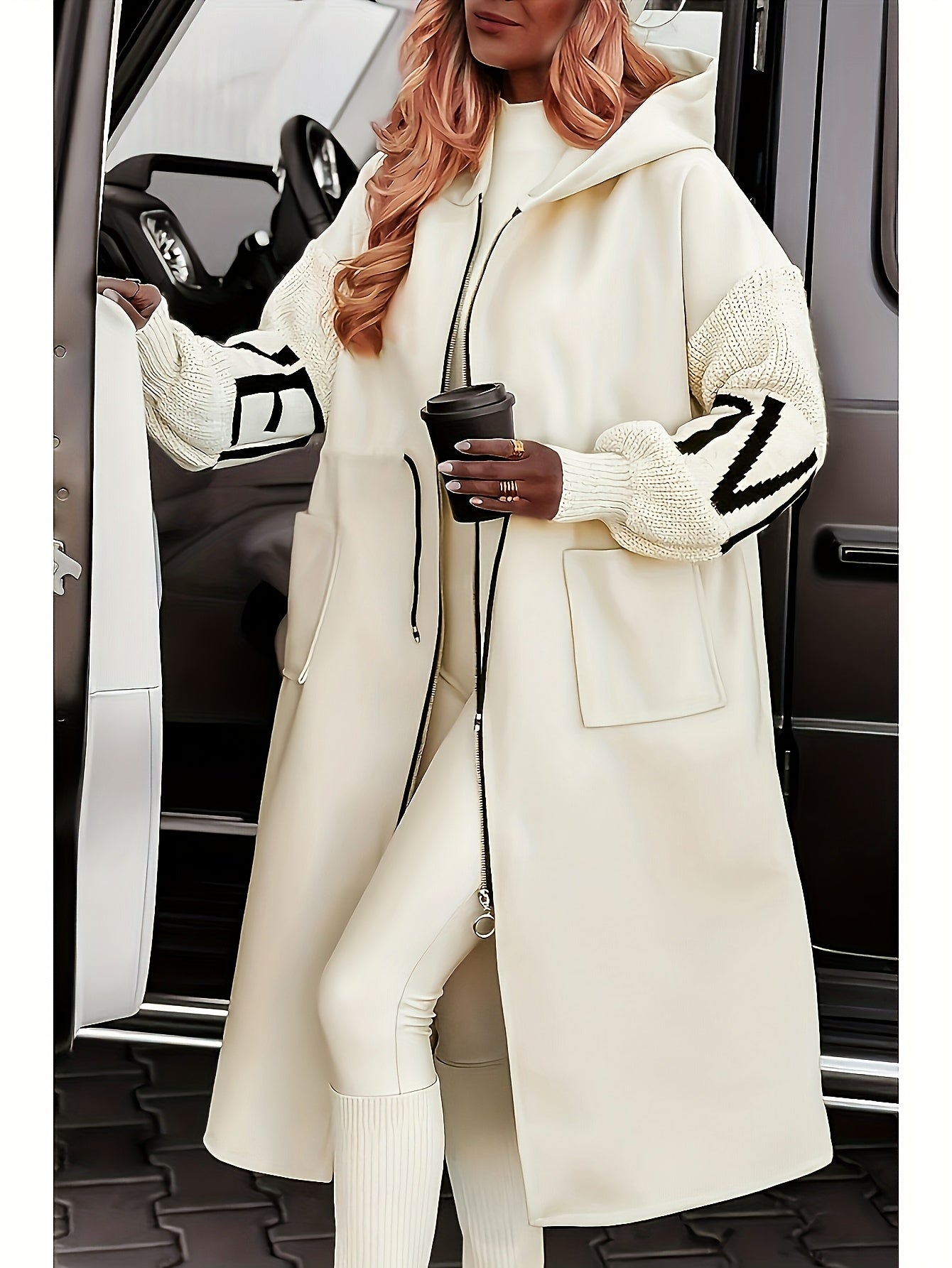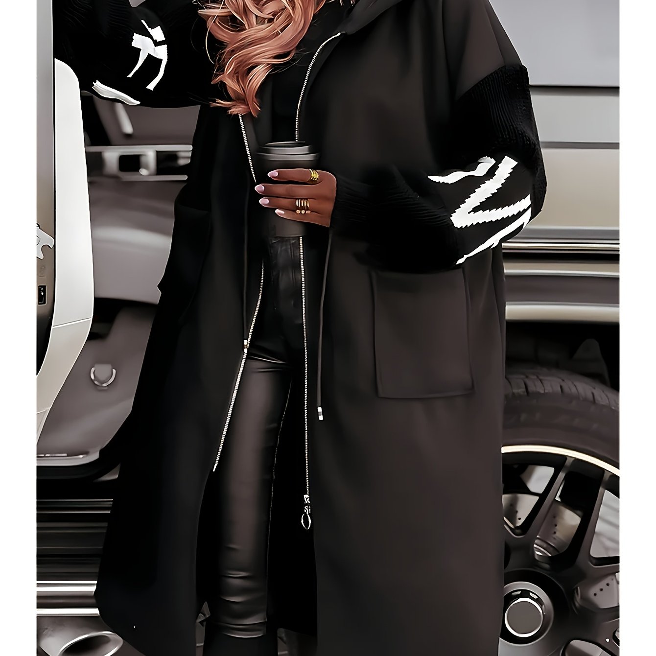 New All-Season Women's Casual Hooded Coat | Black & White Letter Pattern, Structured Fit, Machine Washable Outerwear, Versatile Fashion, Elastic-Free Fabric