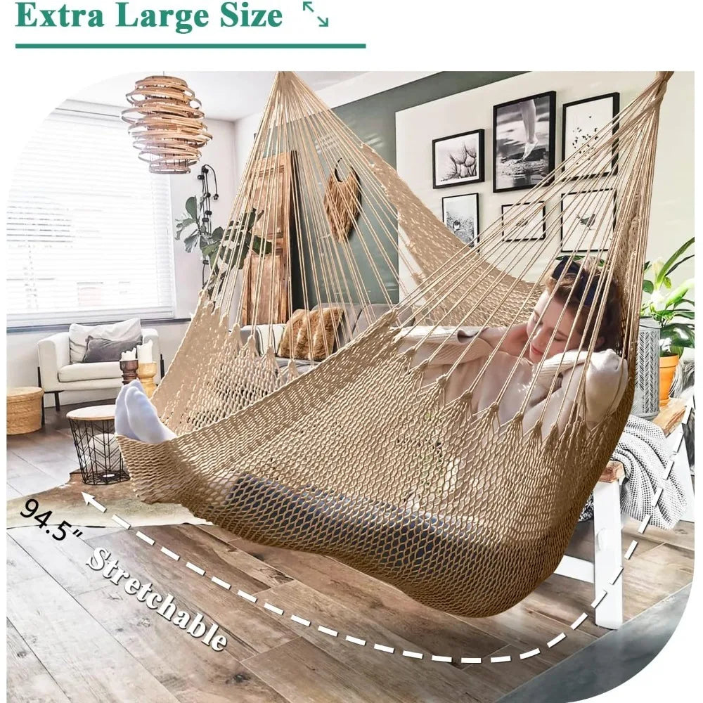 Relax in spacious comfort with this upgraded Caribbean-style hammock chair, designed for both indoor and outdoor use. Crafted from durable hand-woven 100% polyester, it offers a soft yet sturdy seat that’s safe for bare skin and built to last.